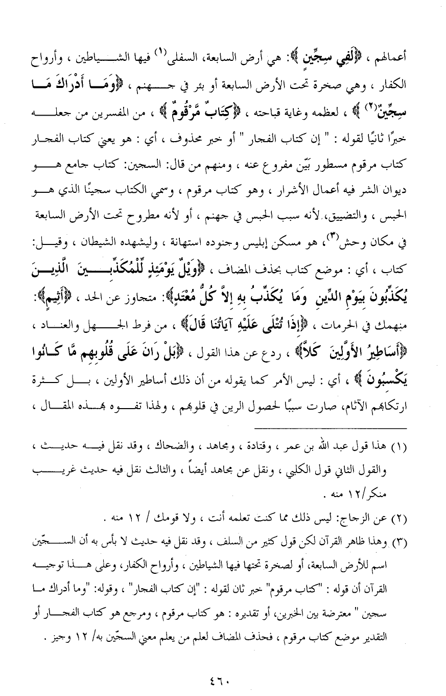 أعمالهم، (لَفِي سِجِّينٍ): هي أرض السابعة، السفلى فيها الشياطين، وأرواح الكفار، وهي صخرة تحت الأرض السابعة أو بئر في جهنم، (وَمَا أَدْرَاكَ مَا سِجِّينٌ)، لعظمه وغاية قباحته، (كِتَابٌ مرْقُوم)، من المفسرين من جعله خبرًا ثانيًا لقوله: " إن كتاب الفجار " أو خبر محذوف، أي: هو يعني كتاب الفجار كتاب مرقوم مسطور بَيِّن [مختوم عليه]، ومنهم من قال: السجين: كتاب جامع هو ديوان الشر فيه أعمال الأشرار، وهو كتاب مرقوم، وسمي الكتاب سجينًا الذي هو الحبس، والتضييق، لأنه سبب الحبس في جهنم، أو لأنه مطروح تحت الأرض السابعة في مكان وحش، هو مسكن إبليس وجنوده استهانة، وليشهده الشيطان، وقيل: كتاب، أي: موضع كتاب بحذف المضاف، (وَيْل يَوْمَئِذٍ للْمُكَذِّبِينَ الَّذِينَ يُكَذِّبُونَ بِيَوْمِ الدِّينِ وَمَا يُكَذِّبُ بِهِ إِلَّا كُل مُعْتَدٍ): متجاوز عن الحد، (أَثِيمٍ): منهمك في الحرمات، (إِذَا تُتْلَى عَلَيْهِ آيَاتُنَا قَالَ)، من فرط الجهل والعناد، (أَسَاطِيرُ الْأَوَّلِينَ كَلَّا)، ردع عن هذا القول، (بَلْ رَانَ عَلَى قُلُوبِهِم مَّا كَانوا يَكْسِبُون)، أي: ليس الأمر كما يقوله من أن ذلك أساطير الأولين، بل كثرة ارتكابهم الآثام، صارت سببًا لحصول الرين في قلوبهم، ولهذا تفوه بهذا المقال،