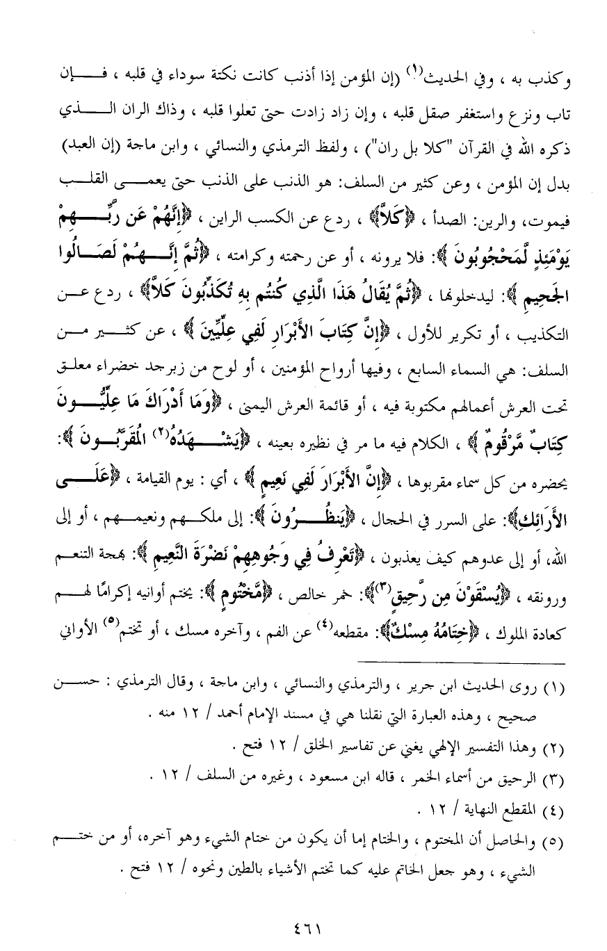 وكذب به، وفي الحديث (إن المؤمن إذا أذنب كانت نكتة سوداء في قلبه، فإن تاب ونزع واستغفر صقل قلبه، وإن زاد زادت حتى تعلوا قلبه، وذاك الران الذي ذكره الله في القرآن "كلا بل ران")، ولفظ الترمذي والنسائي، وابن ماجة (إن العبد) بدل إن المؤمن، وعن كثير من السلف: هو الذنب على الذنب حتى يعمى القلب فيموت، والرين: الصدأ، (كَلَّا)، ردع عن الكسب الراين، (إِنَّهُمْ عَنْ رَبِّهِمْ يَوْمَئِذٍ لَمَحْجُوبُون): فلا يرونه، أو عن رحمته وكرامته، (ثُمَّ إِنَّهُمْ لَصَالُو الجَحِيمِ): ليدخلونها، (ثُمَّ يُقَالُ هَذَا الَّذِي كُنْتُمْ بِهِ تُكَذِّبُونَ كَلَّا)، ردع عن التكذيب، أو تكرير للأول، (إِنَّ كِتَابَ الْأَبْرَارِ لَفِي عِلِّيِّينَ)، عن كثير من السلف: هي السماء السابع، وفيها أرواح المؤمنين، أو لوح من زبرجد خضراء معلق تحت العرش أعمالهم مكتوبة فيه، أو قائمة العرش اليمنى، (وَمَا أَدْرَاكَ مَا عِلِّيُّونَ كتَابٌ مَّرْقُوم)، الكلام فيه ما مر في نظيره بعينه، (يَشْهَدُهُ الُمقَربونَ): يحضره من كل سماء مقربوها، (إِن الأَبْرَارَ لَفِي نَعِيمٍ)، أي: يوم القيامة، (عَلَى الأَرَائِكِ): على السرر في الحجال، (يَنظُرُونَ): إلى ملكهم ونعيمهم، أو إلى الله، أو إلى عدوهم كيف يعذبون، (تَعْرِفُ فِي وَجُوهِهِمْ نَضْرَةَ النَّعِيمِ): بهجة التنعم ورونقه، (يُسْقَوْنَ مِن رحِيقٍ): خمر خالص، (مَخْتُومٍ): يختم أوانيه إكرامًا لهم كعادة الملوك، (خِتَامُهُ مِسْكٌ): مقطعه عن الفم، وآخره مسك، أو تختم الأواني
