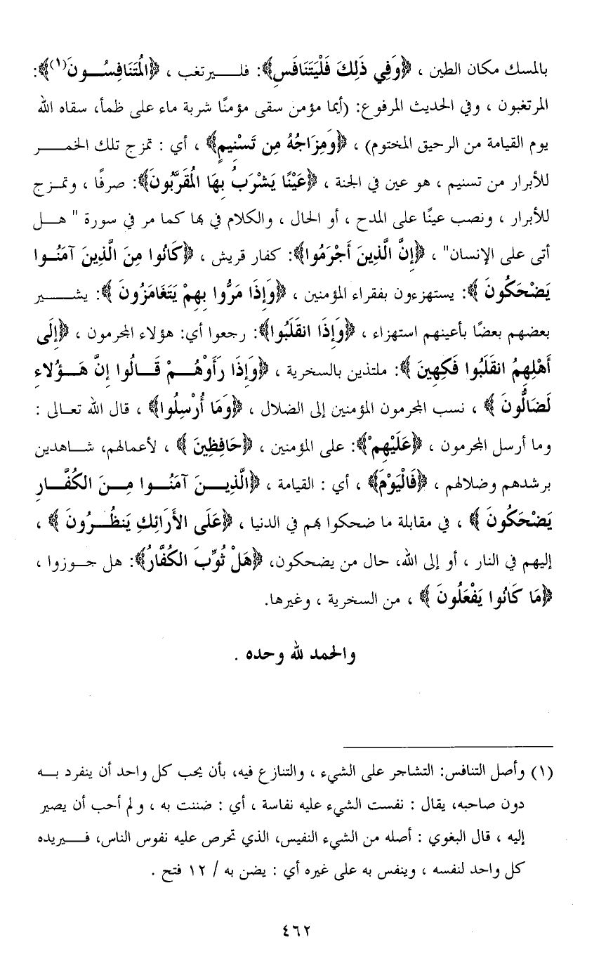 بالمسك مكان الطين، (وَفِي ذَلِكَ فَلْيَتَنَافَسِ): فليرتغب، (المُتَنَافسُونَ): المرتغبون، وفي الحديث المرفوع: (أيما مؤمن سقى مؤمنًا شربة ماء على ظمإٍ، سقاه الله يوم القيامة من الرحيق المختوم)، (وَمِزَاجُهُ مِن تَسْنِيمٍ)، أي: تمزج تلك الخمر للأبرار من تسنيم، هو عين في الجنة، (عَيْنًا يَشْرَبُ بِهَا المُقَربونَ): صرفًا، وتمزج للأبرار، ونصب عينًا على المدح، أو الحال، والكلام فيها كما مر في سورة " هل أتى على الإنسان "، (إِنَّ الَّذِينَ أَجْرَمُوا): كفار قريش، (كَانُوا مِنَ الَّذِينَ آمَنُوا يَضْحَكُون): يستهزءون بفقراء المؤمنين، (وَإِذَا مَرُّوا بِهِمْ يَتَغَامَزُون): يشير بعضهم بعضًا بأعينهم استهزاء، (وَإِذا انقَلَبُوا): رجعوا أي: هؤلاء المجرمون، (إِلَى أَهْلِهمُ انقَلَبُوا فَكِهِينَ): ملتذين بالسخرية، (وَإِذَا رَأَوْهُمْ قَالُوا إِنَّ هَؤُلاءِ لَضَالُّونَ)، نسب المجرمون المؤمنين إلى الضلال، (وَمَا أُرْسِلُوا)، قال الله تعالى: وما أرسل المجرمون، (عليهم): على المؤمنين، (حَافِظِينَ)، لأعمالهم، شاهدين برشدهم وضلالهم، (فَالْيَوْمَ)، أي: القيامة، (الذِينَ آمَنُوا مِنَ الكُفارِ يَضْحَكُونَ)، في مقابلة ما ضحكوا بهم في الدنيا، (عَلَى الأَرَائِكِ يَنظُرُونَ)، إليهم في النار، أو إلى الله، حال من يضحكون، (هَلْ ثُوِّبَ الكفارُ): هل جوزوا، (مَا كَانُوا يَفْعَلُون)، من السخرية، وغيرها.