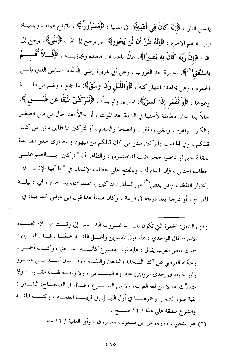 يدخل النار، (إِنَّهُ كَانَ فِي أَهْلِهِ): في الدنيا، (مَسْرُورًا)، باتباع هواه، وبدنياه ليس له هم الآخرة، (إِنَّهُ ظَنَّ أَن لن يَحُورَ): لن يرجع إلى الله، (بَلَى): يرجع إلى الله، (إِنَّ رَبَّهُ كَانَ بِهِ بَصِيرًا): عالمًا بأعماله، فيعيده ويجازيه، (فَلاَ أُقْسِم بِالشَّفَقِ): الحمرة بعد الغروب، وعن أبي هريرة رضي الله عنه: البياض الذي يلي الحمرة، وعن مجاهد: النهار كله، (وَالليْلِ وَمَا وَسَقَ): ما جمع، وضم من دابة وغيرها، (وَالْقَمَرِ إِذَا اتَّسَقَ): استوى وتم بدرًا، (لَتَركَبُنَّ طَبَقًا عَن طَبَقٍ): حالاً بعد حال مطابقة لأختها في الشدة بعد الموت، أو حالاً بعد حال من مثل الصغر والكبر، والهرم، والغنى والفقر، والصحة والسقم، أو لتركبن ما طابق سنن من كان قبلكم، وفي الحديث (لتركبن سنن من كان قبلكم من اليهود والنصارى حذو القذة بالقذة حتى لو دخلوا جحر ضب لدخلتموه)، والظاهر أن (لَتَرْكَبُنَّ) بالضم على خطاب الجنس، فإن النداء له، وبالفتح على خطاب الإنسان في " يا أيها الإنسان " باعتبار اللفظ، وعن بعض من السلف: (لَتَرْكَبَنَّ) يا محمد سماء بعد سماء، أي: ليلة المعراج، أو درجة بعد درجة في الرتبة، وكان منشأ هذا قول ابن عباس كما بيناه في