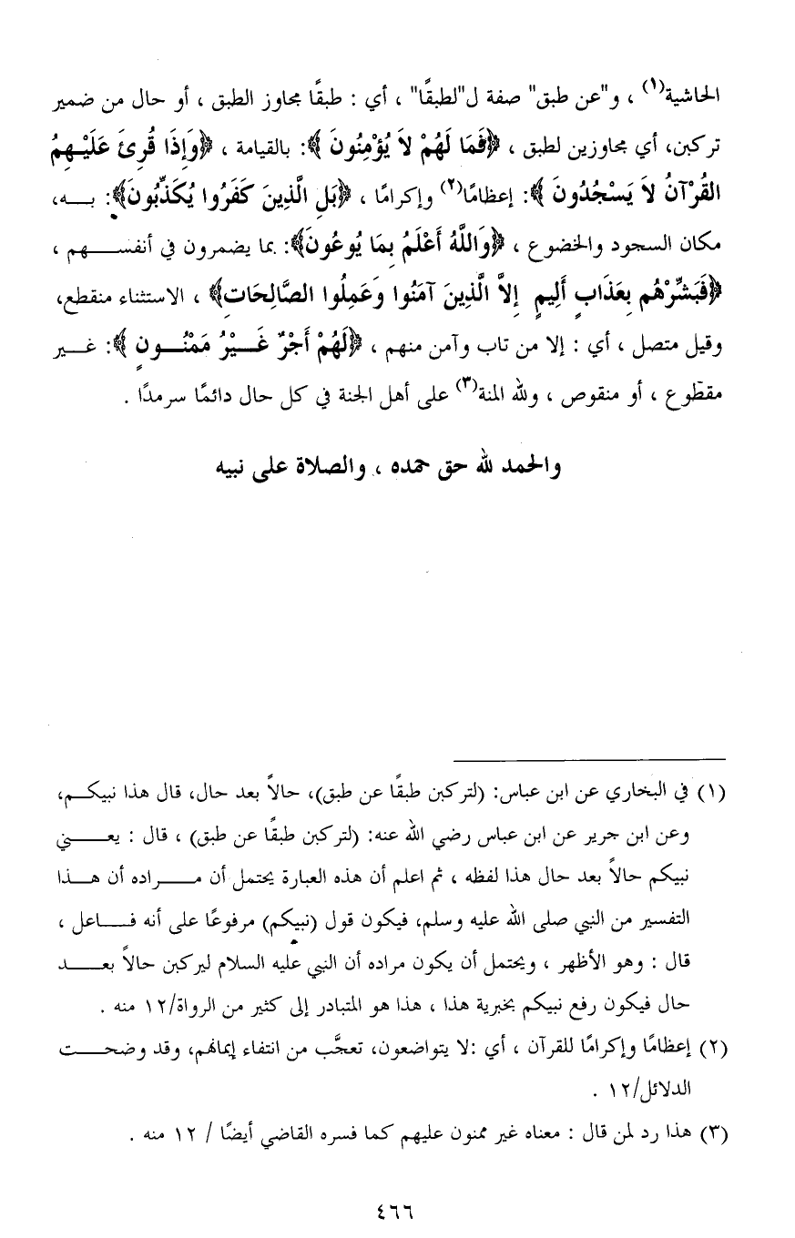 الحاشية، و " عن طبق " صفة لـ " طبقًا "، أي: طبقًا مجاوز الطبق، أو حال من ضمير تركبن، أي مجاوزين لطبق، (فَمَا لَهُمْ لا يُؤْمِنُونَ): بالقيامة، (وَإِذَا قُرِئَ عَلَيْهِمُ الْقُرْآنُ لَا يَسْجُدُونَ): إعظامًا وإكرامًا، (بَلِ الَّذِينَ كَفَرُوا يُكَذِّبُونَ): به، مكان السجود والخضوع، (وَاللهُ أَعْلَمُ بِمَا يُوعُون): بما يضمرون في أنفسهم، (فَبَشِّرْهُم بِعَذَابٍ أَلِيمٍ إِلا الَّذِينَ آمَنُوا وَعَمِلُوا الصَّالِحَاتِِ)، الاستثناء منقطع، وقيل متصل، أي: إلا من تاب وآمن منهم، (لَهُمْ أَجْرٌ غَيْرُ مَمْنُونٍ): غير مقطوع، أو منقوص، ولله المنة على أهل الجنة في كل حال دائمًا سرمدًا.