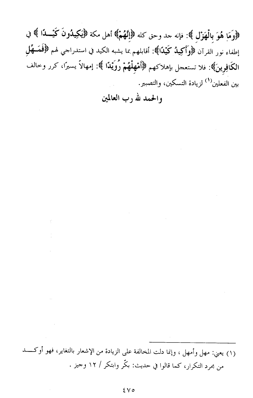 (وَمَا هُوَ بِالْهَزْلِ): فإنه جد وحق كله (إِنَّهُمْ) أهل مكة (يَكِيدُونَ كَيْدًا) في إطفاء نور القرآن (وَأَكِيدُ كَيْدًا): أقابلهم بما يشبه الكيد في استدراجي لهم (فَمَهِّلِ الْكَافِرِينَ): فلا تستعجل بإهلاكهم (أَمْهِلْهُمْ روَيْدًا): إمهالاً يسيرًا، كرر وخالف بين الفعلين لزيادة التسكين، والتصبير.