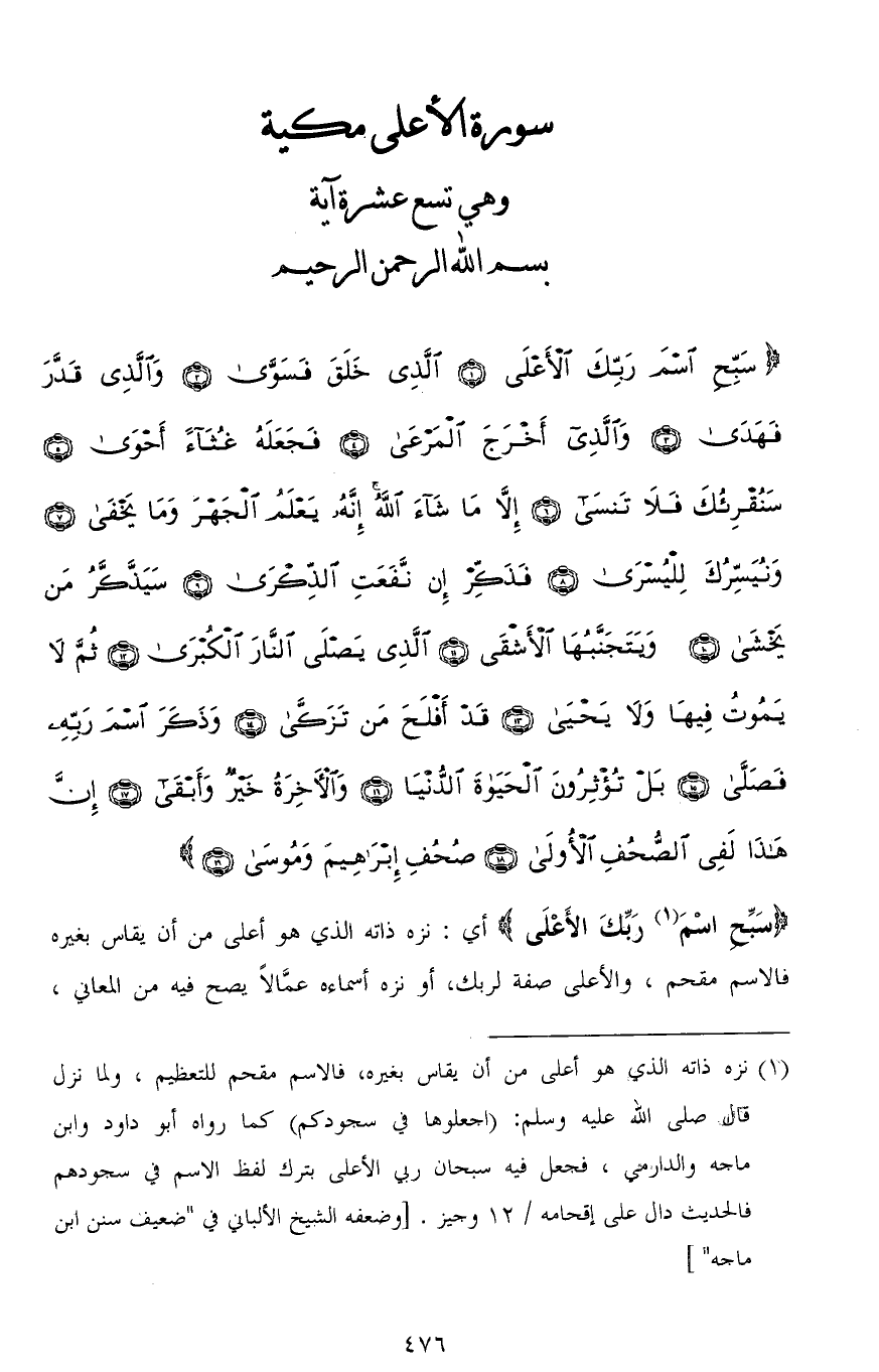 (سَبِّحِ اسْمَ رَبِّكَ الْأَعْلَى (1) الَّذِي خَلَقَ فَسَوَّى (2) وَالَّذِي قَدَّرَ فَهَدَى (3) وَالَّذِي أَخْرَجَ الْمَرْعَى (4) فَجَعَلَهُ غُثَاءً أَحْوَى (5) سَنُقْرِئُكَ فَلَا تَنْسَى (6) إِلَّا مَا شَاءَ اللهُ إِنَّهُ يَعْلَمُ الْجَهْرَ وَمَا يَخْفَى (7) وَنُيَسِّرُكَ لِلْيُسْرَى (8) فَذَكِّرْ إِنْ نَفَعَتِ الذِّكْرَى (9) سَيَذَّكَّرُ مَنْ يَخْشَى (10) وَيَتَجَنَّبُهَا الْأَشْقَى (11) الَّذِي يَصْلَى النَّارَ الْكُبْرَى (12) ثُمَّ لَا يَمُوتُ فِيهَا وَلَا يَحْيَى (13) قَدْ أَفْلَحَ مَنْ تَزَكَّى (14) وَذَكَرَ اسْمَ رَبِّهِ فَصَلَّى (15) بَلْ تُؤْثِرُونَ الْحَيَاةَ الدُّنْيَا (16) وَالْآخِرَةُ خَيْرٌ وَأَبْقَى (17) إِنَّ هَذَا لَفِي الصُّحُفِ الْأُولَى (18) صُحُفِ إِبْرَاهِيمَ وَمُوسَى (19)