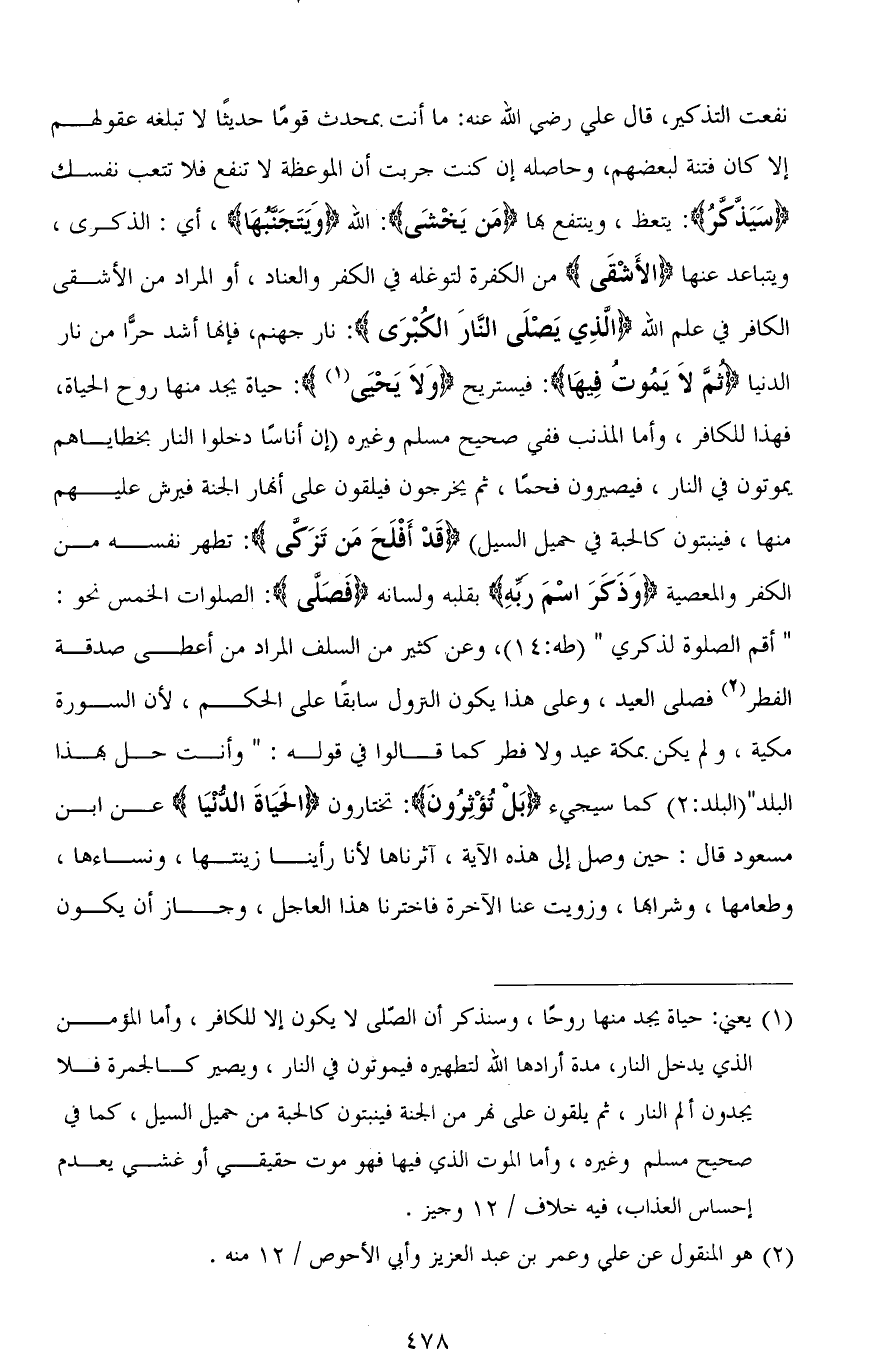 نفعت التذكير، قال على رضي الله عنه: ما أنت بمحدث قومًا حديثًا لا تبلغه عقولهم إلا كان فتنة لبعضهم، وحاصله إن كنت جربت أن الموعظة لا تنفع فلا تتعب نفسك (سَيَذَّكَّرُ): يتعظ، وينتفع بها (مَن يَخْشَى): الله (وَيَتَجَنَّبُهَا)، أي: الذكرى، ويتباعد عنها (الأَشقَى) من الكفرة لتوغله في الكفر والعناد، أو المراد من الأشقى الكافر في علم الله (الذِي يَصْلَى النَّارَ الكُبْرَى): نار جهنم، فإنما أشد حرًّا من نار الدنيا (ثُمَّ لَا يَمُوتُ فِيهَا): فيستريح (وَلَا يَحْيَى): حياة يجد منها روح الحياة، فهذا للكافر، وأما المذنب ففي صحيح مسلم وغيره (إن أناسًا دخلوا النار بخطاياهم يموتون في النار، فيصيرون فحمًا، ثم يخرجون فيلقون على أنهار الجنة فيرش عليهم منها، فينبتون كالحبة في حميل السيل) (قَدْ أَفْلَحَ مَنْ تَزَكَّى): تطهر نفسه من الكفر والمعصية (وَذَكَرَ اسْمَ رَبِّهِ) بقلبه ولسانه (فَصَلَّى): الصلوات الخمس نحو: " أقم الصلوة لذكري " [طه: 14]، وعن كثير من السلف المراد من أعطى صدقة الفطر فصلى العيد، وعلى هذا يكون النزول سابقًا على الحكم، لأن السورة مكية، ولم يكن بمكة عيد ولا فطر كما قالوا في قوله: (وَأَنْتَ حِلٌّ بِهَذَا الْبَلَدِ) كما سيجيء (بَلْ تُؤْثِرُونَ): تختارون (الْحَيَاةَ الدُّنْيَا) عن ابن مسعود قال: حين وصل إلى هذه الآية، آثرناها لأنَّا رأينا زينتها، ونساءها، وطعامها، وشرابها، وزويت عنا الآخرة فاخترنا هذا العاجل، وجاز أن يكون