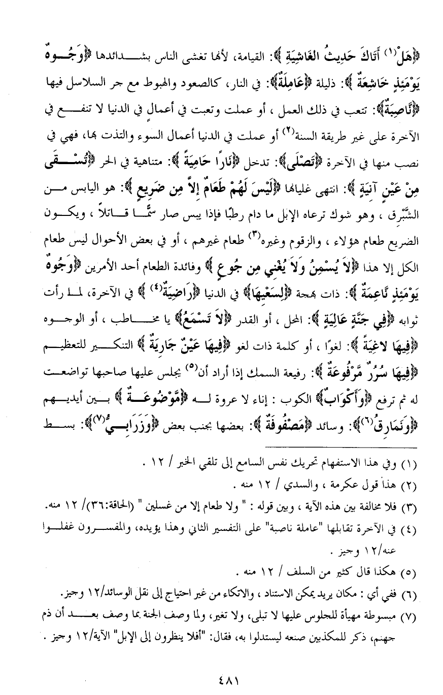 (هَلْ أَتَاكَ حَدِيثُ الْغَاشِيَةِ): القيامة، لأنها تغشى الناس بشدائدها (وَجُوهٌ يَوْمَئِذٍ خَاشِعَةٌ): ذليلة (عَامِلَةٌ): في النار، كالصعود والهبوط مع جر السلاسل فيها (نَاصِبَةٌ): تتعب في ذلك العمل، أو عملت وتعبت في أعمالٍ في الدنيا لا تنفع في الآخرة على غير طريقة السنة أو عملت في الدنيا أعمال السوء والتذت بها، فهي في نصب منها في الآخرة (تَصْلَى): تدخل (نَارا حَامِيَةً): متناهية في الحر (تُسْقَى مِنْ عَيْنٍ آنيةٍ): انتهى غليانها (لَيْسَ لَهُمْ طعامٌ إِلا مِن ضَرِيعٍ): هو اليابس من الشَّبْرِق، وهو شوك ترعاه الإبل ما دام رطبًا فإذا يبس صار سُمًّا قاتلاً، ويكون الضريع طعام هؤلاء، والزقوم وغيره طعام غيرهم، أو في بعض الأحوال ليس طعام الكل إلا هذا (لَا يُسْمِنُ وَلَا يُغْنِي مِنْ جُوعٍ) وفائدة الطعام أحد الأمرين (وُجُوهٌ يَوْمَئِذٍ نَاعِمَةٌ): ذات بهجة (لِسَعْيهَا) في الدنيا (رَاضِيَةٌ) في الآخرة، لما رأت ثوابه (فِي جَنَّةٍ عَالِيَةٍ): المحل، أو القدر (لاَ تَسْمَعُ) يا مخاطب، أو الوجوه (فِيهَا لَاغِيَةً): لغوًا، أو كلمة ذات لغو (فِيهَا عَيْنٌ جَارِيَةٌ) التنكير للتعظيم (فِيهَا سُرُرٌ مرْفُوعَةٌ): رفيعة السمك إذا أراد أن يجلس عليها صاحبها تواضعت له ثم ترفع (وَأَكوَابٌ) الكوب: إناء لا عروة له (مَّوْضُوعَةٌ) بين أيديهم (وَنَمَارِقُ): وسائد (مَصْفُوفَةٌ): بعضها بجنب بعض (وَزَرَابِيُّ): بسط