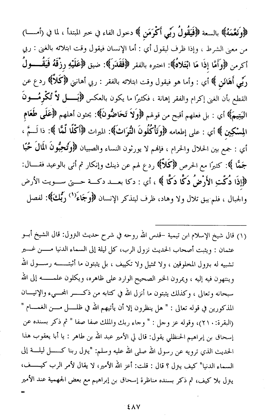 (وَنَعَّمَهُ) بالسعة (فَيَقُولُ رَبِّي أَكْرَمَنِ) دخول الفاء في خبر المبتدأ، لما في (أما) من معنى الشرط، وإذا ظرف ليقول أي: أما الإنسان فيقول وقت ابتلائه بالغنى: ربي أكرمن (وَأَمَّا إِذَا مَا ابْتَلَاهُ): اختبره بالفقر (فَقَدَرَ): ضيق (عَلَيْهِ رِزْقَهُ فَيَقُولُ رَبِّي أَهَانَنِ) أي: وأما هو فيقول وقت ابتلائه بالفقر: ربي أهانني (كَلَّا) ردع عن القطع بأن الغنى إكرام والفقر إهانة، فكثيرًا ما يكون بالعكس (بَل لا تُكْرِمون اليَتِيمَ) أي: بل فعلهم أقبح من قولهم (وَلاَ تَحَاضُّونَ): يحثون أهلهم (عَلَى طَعامِ المِسْكِينِ) أي: على إطعامه (وَتَأكُلُونَ التُّرَاثَ): الميراث (أَكْلًا لَمًّا): ذا لَمَّ، أي: جمع بين الحلال والحرام، فإنهم لا يورثون النساء والصبيان (وَتُحِبُّونَ الْمَالَ حُبًّا جَمًّا): كثيرًا مع الحرص (كَلَّا) ردع لهم عن ذينك وإنكار ثم أتى بالوعيد فقال: (إِذَا دُكَّتِ الْأَرْضُ دَكًّا دَكًّا)، أي: دكا بعد دكة حتى سويت الأرض والجبال، فلمْ يبق تلال ولا وهاد، ظرف ليتذكر الإنسان (وَجَاءَ رَبُّكَ): لفصل