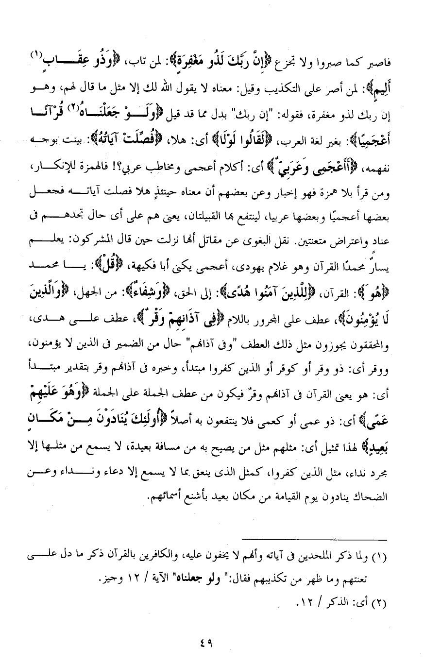 فاصبر كما صبروا ولا تجزع (إِنَّ رَبَّكَ لَذُو مَغْفِرَةٍ): لمن تاب، (وَذُو عِقَابٍ أَلِيمٍ): لمن أصر على التكذيب وقيل: معناه لا يقول الله لك إلا مثل ما قال لهم، وهو إن ربك لذو مغفرة، فقوله: " إن ربَّك " بدل مما قد قيل (وَلَوْ جَعَلْنَاهُ قُرْآنًا أَعْجَمِيًّا): بغير لغة العرب، (لَقَالُوا لَوْلَا) أي: هلا، (فُصِّلَتْ آيَاتُهُ): بينت بوجه نفهمه، (أَأَعْجَمِيٌّ وَعَرَبِيٌّ) أي: أكلام أعجمي ومخاطب عربي؟! فالهمزة للإنكار، ومن قرأ بلا همزة فهو إخبار وعن بعضهم أن معناه حينئذٍ هلا فصلت آياته فجعل بعضها أعجميًا وبعضها عربيًا، لينتفع بها القبيلتان، يعني هم على أي حال تجدهم في عنادٍ واعتراض متعنتين. نقل البغوي عن مقاتل أنها نزلت حين قال المشركون: يعلم يسارٌ محمدًا القرآن وهو غلام يهودي، أعجمي يكني أبا فكيهة، (قُلْ): يا محمد (هُوَ): القرآن، (لِلَّذِينَ آمَنُوا هُدًى): إلي الحق، (وَشِفَاءٌ): من الجهل، (وَالَّذِينَ لَا يُؤْمِنُونَ)، عطف على المجرور باللام (فِى آذَانِهِمْ وَقْرٌ)، عطف على هدى، والمحققون يجوزون مثل ذلك العطف " وفي آذانهم " حال من الضمير في الذين لا يؤمنون، ووقر أي: ذو وقر أو كوقر أو الذين كفروا مبتدأ، وخبره في آذانهم وقر بتقدير مبتدأ أى: هو يعني القرآن في آذانهم وقرٌ فيكون من عطف الجملة على الجملة (وَهُوَ عَلَيْهِمْ عَمًى) أي: ذو عمى أو كعمى فلا ينتفعون به أصلاً (أُولَئِكَ يُنَادَوْنَ مِنْ مَكَانٍ بَعِيدٍ) لهذا تمثيل أي: مثلهم مثل من يصيح به من مسافة بعيدة، لا يسمع من مثلها إلا مجرد نداء، مثل الذين كفروا، كمثل الذي ينعق بما لا يسمع إلا دعاء ونداء وعن الضحاك ينادون يوم القيامة من مكان بعيد بأشنع أسمائهم.