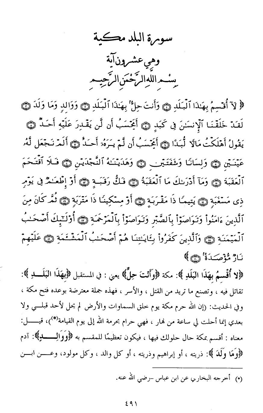 (لَا أُقْسِمُ بِهَذَا الْبَلَدِ (1) وَأَنْتَ حِلٌّ بِهَذَا الْبَلَدِ (2) وَوَالِدٍ وَمَا وَلَدَ (3) لَقَدْ خَلَقْنَا الْإِنْسَانَ فِي كَبَدٍ (4) أَيَحْسَبُ أَنْ لَنْ يَقْدِرَ عَلَيْهِ أَحَدٌ (5) يَقُولُ أَهْلَكْتُ مَالًا لُبَدًا (6) أَيَحْسَبُ أَنْ لَمْ يَرَهُ أَحَدٌ (7) أَلَمْ نَجْعَلْ لَهُ عَيْنَيْنِ (8) وَلِسَانًا وَشَفَتَيْنِ (9) وَهَدَيْنَاهُ النَّجْدَيْنِ (10) فَلَا اقْتَحَمَ الْعَقَبَةَ (11) وَمَا أَدْرَاكَ مَا الْعَقَبَةُ (12) فَكُّ رَقَبَةٍ (13) أَوْ إِطْعَامٌ فِي يَوْمٍ ذِي مَسْغَبَةٍ (14) يَتِيمًا ذَا مَقْرَبَةٍ (15) أَوْ مِسْكِينًا ذَا مَتْرَبَةٍ (16) ثُمَّ كَانَ مِنَ الَّذِينَ آمَنُوا وَتَوَاصَوْا بِالصَّبْرِ وَتَوَاصَوْا بِالْمَرْحَمَةِ (17) أُولَئِكَ أَصْحَابُ الْمَيْمَنَةِ (18) وَالَّذِينَ كَفَرُوا بِآيَاتِنَا هُمْ أَصْحَابُ الْمَشْأَمَةِ (19) عَلَيْهِمْ نَارٌ مُؤْصَدَةٌ (20)