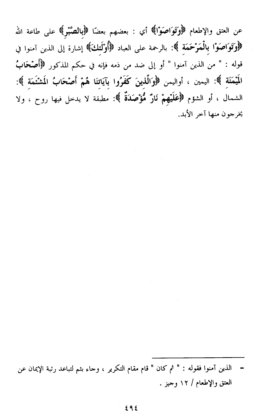 عن العتق والإطعام (وَتَوَاصَوْا) أي: بعضهم بعضًا (بِالصَّبْرِ) على طاعة الله (وَتَوَاصَوْا بِالْمَرْحَمَةِ): بالرحمة على العباد (أوْلَئِكَ) إشارة إلى الذين آمنوا في قوله: " من الذين آمنوا " أو إلى ضد من ذمه فإنه في حكم المذكور (أَصْحَابُ المَيْمَنَةِ): اليمين، أو اليمن (وَالَّذِينَ كَفَرُوا بِآيَاتِنَا هُمْ أَصْحَابُ المَشْئَمَةِ): الشمال، أو الشؤم (عَلَيْهِمْ نَارٌ مُؤْصَدَةٌ): مطبقة لا يدخل فيها رَوح، ولا يخرجون منها آخر الأبد.