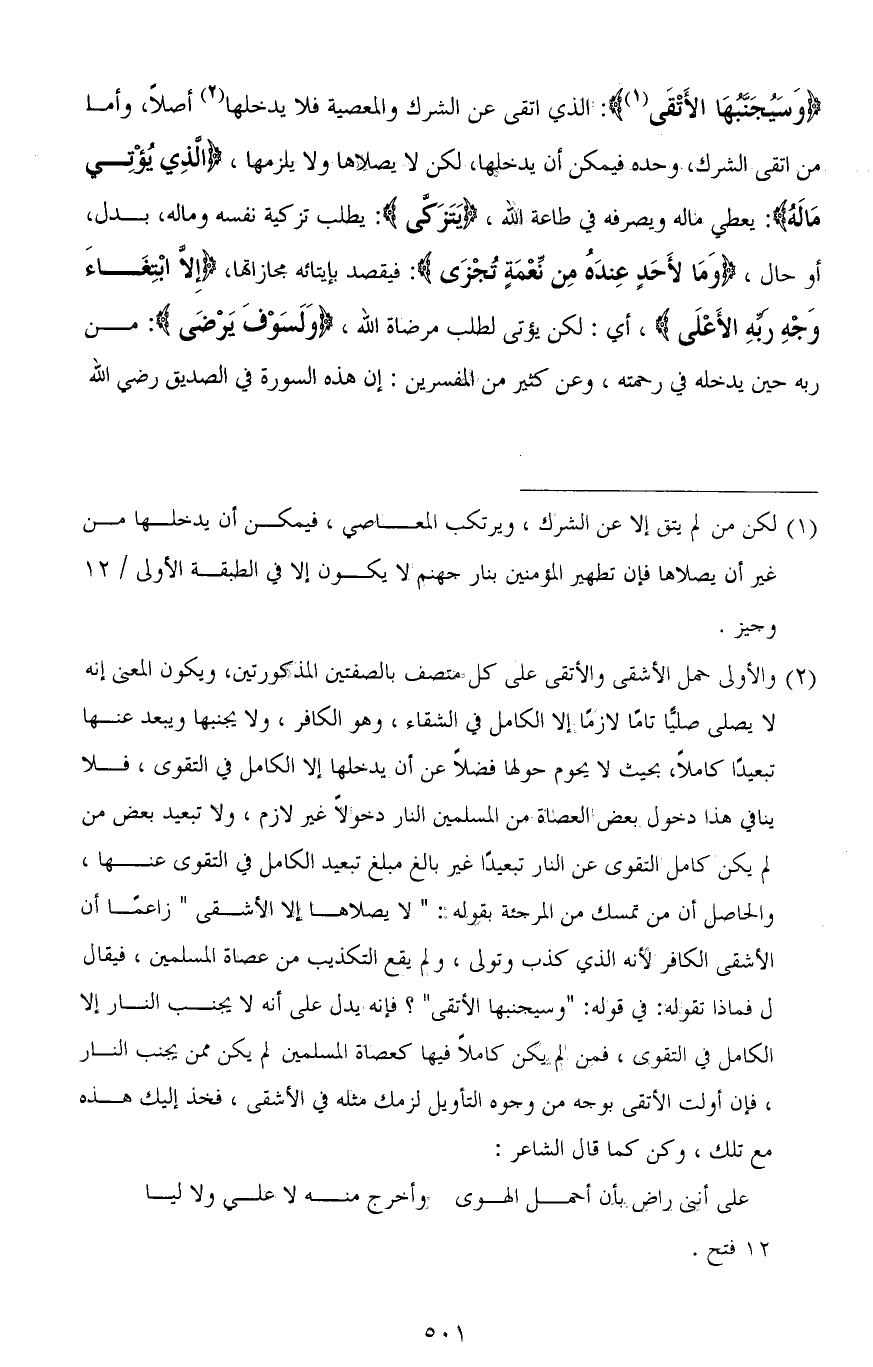 (وَسَيُجَنَّبُهَا الْأَتْقَى): الذي اتقى عن الشرك والمعصية فلا يدخلها أصلاً، وأما من اتقى الشرك وحده فيمكن أن يدخلها، لكن لا يصلاها ولا يلزمها، (الذِي يُؤْتِي مَالَهُ): يعطي ماله ويصرفه في طاعة الله، (يَتَزَكَّى): يطلب تزكية نفسه وماله، بدل، أو حال، (وَمَا لأَحَدٍ عِندَهُ مِن نِّعْمَةٍ تُجْزَى): فيقصد بإيتائه مجازاتها، (إِلَّا ابْتِغَاءَ وَجْهِ رَبِّهِ الْأَعْلَى)، أي: لكن يؤتي لطلب مرضاة الله، (وَلَسَوْفَ يَرْضَى): من ربه حين يدخله في رحمته، وعن كثير من المفسرين: إن هذه السورة في الصديق - رضي الله عنه -