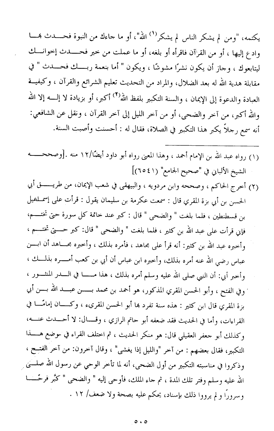 يكتمه، " ومن لم يشكر الناس لم يشكر الله " (1)، أو ما جاءك من النبوة فحدث بها وادع إليها، أو من القرآن فاقرأه أو بلغه، أو ما عملت من خير فحدث إخوانك ليتابعوك، وجاز أن يكون نشرًا مشوشًا، ويكون " أما بنعمة ربك فحدث " في مقابلة هدية الله له بعد الضلال، والمراد من التحديث تعليم الشرائع والقرآن، وكيفية العبادة والدعوة إلى الإيمان، والسنة التكبير بلفظ الله أكبر، أو بزيادة لا إله إلا الله والله أكبر، من آخر والضحى، أو من آخر الليل إلى آخر القرآن، ونقل عن الشافعي: أنه سمع رجلاً يكبر هذا التكبير في الصلاة، فقال له: أحسنت وأصبت السنة.