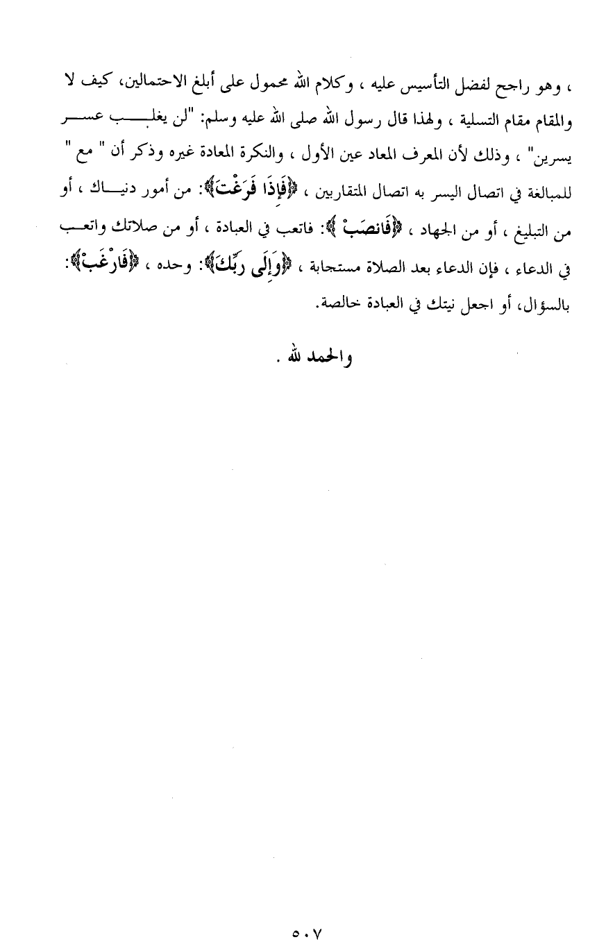 ، وهو راجح لفضل التأسيس عليه، وكلام الله محمول على أبلغ الاحتمالين، كيف لا والمقام مقام التسلية، ولهذا قال رسول الله صلى الله عليه وسلم: " لن يغلب عسر يسرين "، وذلك لأن المعرف المعاد عين الأول، والنكرة المعادة غيره وذكر أن " مع " للمبالغة في اتصال اليسر به اتصال المتقاربين، (فَإِذَا فَرَغْتَ): من أمور دنياك، أو من التبليغ، أو من الجهاد، (فَانْصَبْ): فاتعب في العبادة، أو من صلاتك واتعب في الدعاء، فإن الدعاء بعد الصلاة مستجابة، (وَإِلَى رَبِّكَ): وحده، (فَارْغَبْ): بالسؤال، أو اجعل نيتك في العبادة خالصة.