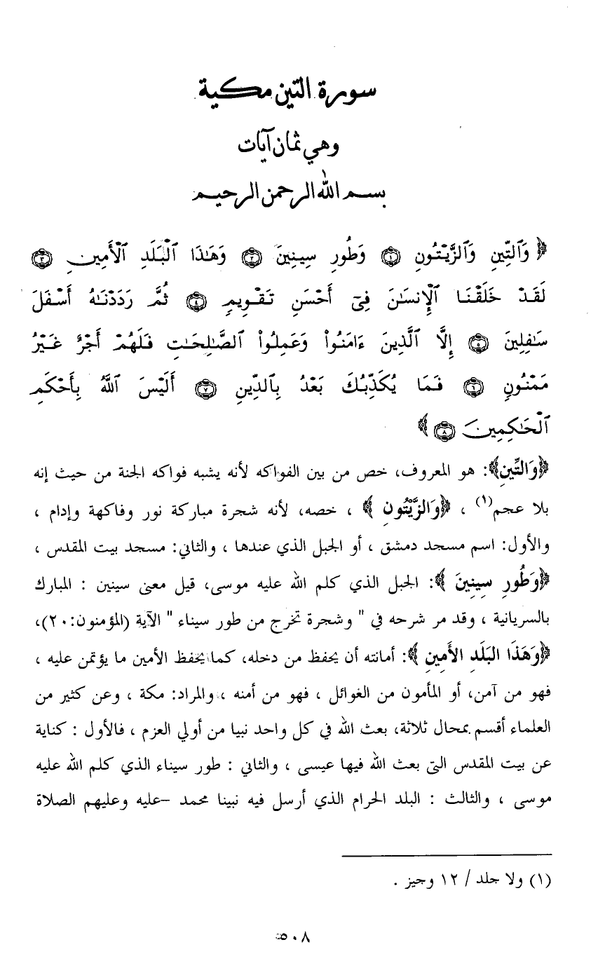 (وَالتِّينِ وَالزَّيْتُونِ (1) وَطُورِ سِينِينَ (2) وَهَذَا الْبَلَدِ الْأَمِينِ (3) لَقَدْ خَلَقْنَا الْإِنْسَانَ فِي أَحْسَنِ تَقْوِيمٍ (4) ثُمَّ رَدَدْنَاهُ أَسْفَلَ سَافِلِينَ (5) إِلَّا الَّذِينَ آمَنُوا وَعَمِلُوا الصَّالِحَاتِ فَلَهُمْ أَجْرٌ غَيْرُ مَمْنُونٍ (6) فَمَا يُكَذِّبُكَ بَعْدُ بِالدِّين (7) أَلَيْسَ اللهُ بِأَحْكَمِ الْحَاكِمِينَ (8)