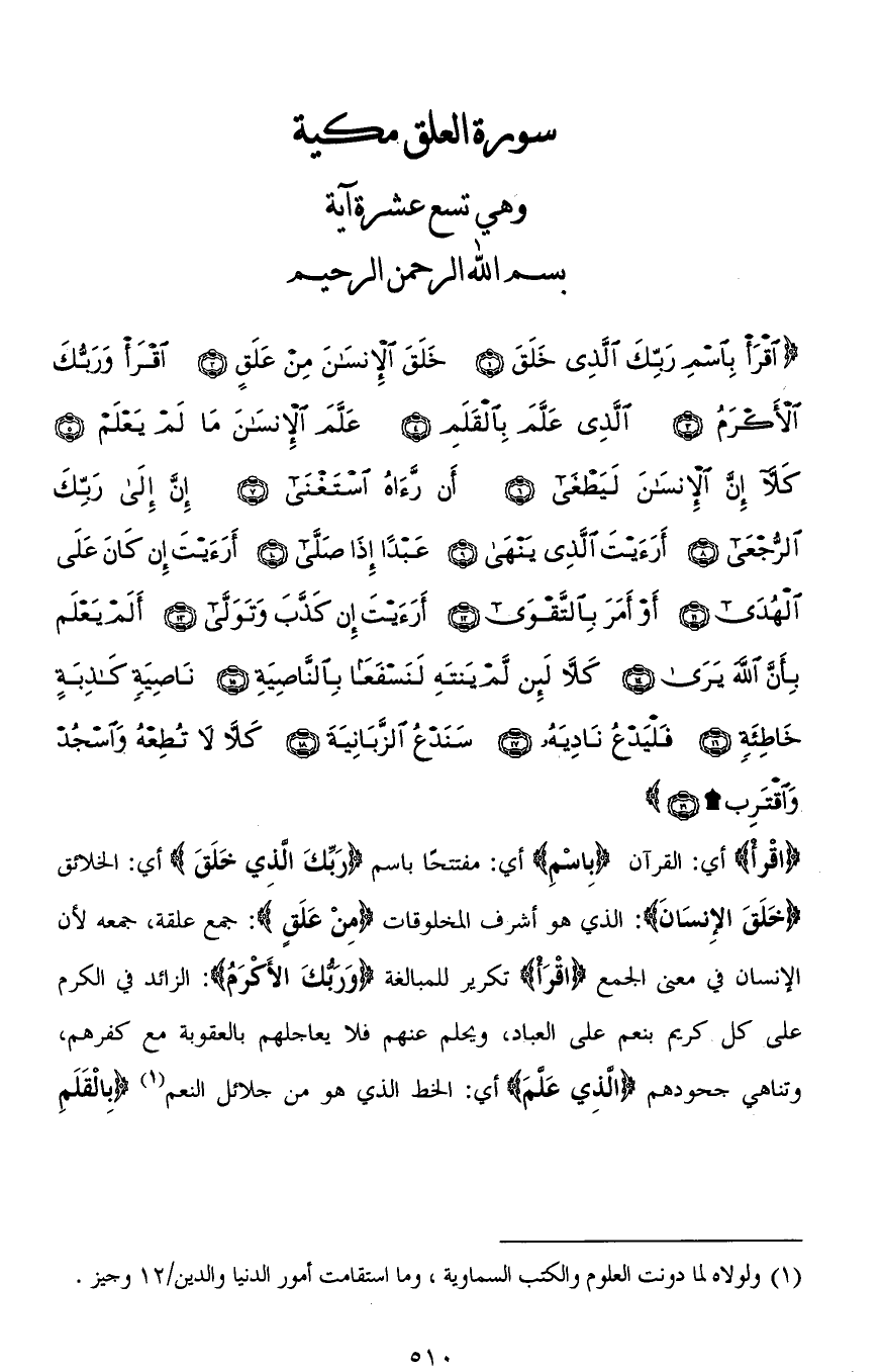 (اقْرَأْ بِاسْمِ رَبِّكَ الَّذِي خَلَقَ (1) خَلَقَ الْإِنْسَانَ مِنْ عَلَقٍ (2) اقْرَأْ وَرَبُّكَ الْأَكْرَمُ (3) الَّذِي عَلَّمَ بِالْقَلَمِ (4) عَلَّمَ الْإِنْسَانَ مَا لَمْ يَعْلَمْ (5) كَلَّا إِنَّ الْإِنْسَانَ لَيَطْغَى (6) أَنْ رَآهُ اسْتَغْنَى (7) إِنَّ إِلَى رَبِّكَ الرُّجْعَى (8) أَرَأَيْتَ الَّذِي يَنْهَى (9) عَبْدًا إِذَا صَلَّى (10) أَرَأَيْتَ إِنْ كَانَ عَلَى الْهُدَى (11) أَوْ أَمَرَ بِالتَّقْوَى (12) أَرَأَيْتَ إِنْ كَذَّبَ وَتَوَلَّى (13) أَلَمْ يَعْلَمْ بِأَنَّ اللهَ يَرَى (14) كَلَّا لَئِنْ لَمْ يَنْتَهِ لَنَسْفَعًا بِالنَّاصِيَةِ (15) نَاصِيَةٍ كَاذِبَةٍ خَاطِئَةٍ (16) فَلْيَدْعُ نَادِيَهُ (17) سَنَدْعُ الزَّبَانِيَةَ (18) كَلَّا لَا تُطِعْهُ وَاسْجُدْ وَاقْتَرِبْ (19)