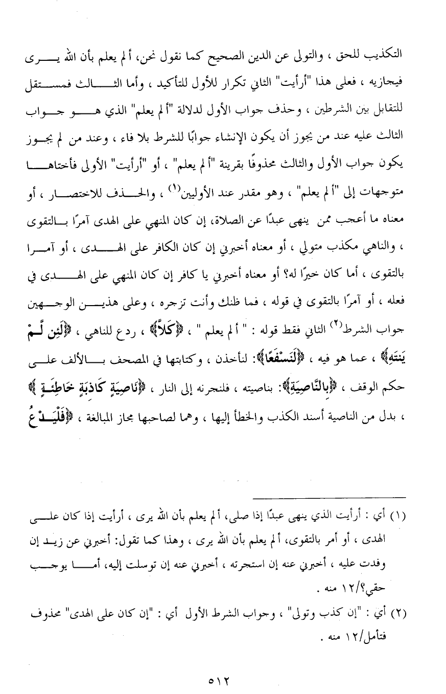 التكذيب للحق، والتولي عن الدين الصحيح كما نقول نحن، ألم يعلم بأن الله يرى فيجازيه، فعلى هذا " أرأيت " الثاني تكرار للأول للتأكيد، وأما الثالث فمستقل للتقابل بين الشرطين، وحذف جواب الأول لدلالة " ألم يعلم " الذي هو جواب الثالث عليه عند من يجوز أن يكون الإنشاء جوابًا للشرط بلا فاء، وعند من لم يجوز يكون جواب الأول والثالث محذوفًا بقرينة " ألم يعلم "، أو " أرأيت " الأولى فأختاها متوجهات إلى " ألم يعلم "، وهو مقدر عند الأوليين، والحذف للاختصار، أو معناه ما أعجب ممن ينهى عبدًا عن الصلاة، إن كان المنهي على الهدى آمرًا بالتقوى، والناهي مكذب متولي، أو معناه أخبرني إن كان الكافر على الهدى، أو آمرًا بالتقوى، أما كان خيرًا له؟ أو معناه أخبرني يا كافر إن كان المنهي على الهدى في فعله، أو آمرًا بالتقوى في قوله، فما ظنك وأنت تزجره؟ وعلى هذين الوجهين جواب الشرط الثاني فقط قوله: " ألم يعلم "، (كلَّا)، ردع للناهي، (لَئِن لَّمْ يَنتَهِ)، عما هو فيه، (لَنَسْفَعًا): لنأخذن، وكتابتها في المصحف بالألف على حكم الوقف، (بِالنَّاصِيَةِ): بناصيته، فلنجرنه إلى النار، (نَاصِيَةٍ كَاذِبَةٍ خَاطِئَةٍ)، بدل من الناصية أسند الكذب والخطأ إليها، وهما لصاحبها مجاز المبالغة، (فَلْيَدْعُ