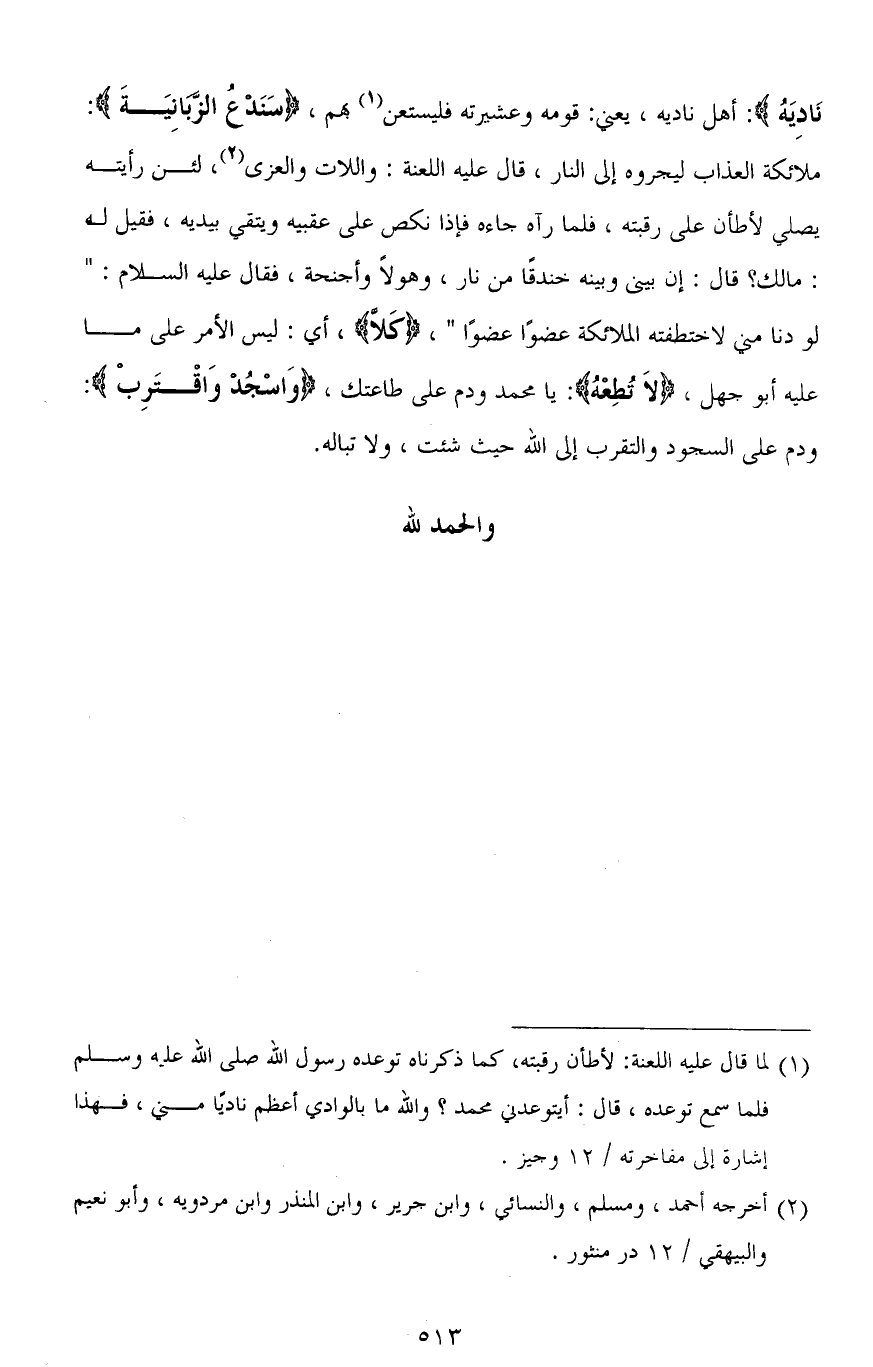 نَادِيَهُ): أهل ناديه، يعني: قومه وعشيرته فليستعن بهم، (سَنَدْعُ الزَّبَانِيَةَ): ملائكة العذاب ليجروه إلى النار، قال عليه اللعنة: واللات والعزى، لئن رأيته يصلي لأطأن على رقبته، فلما رآه جاءه فإذا نكص على عقبيه ويتقي بيديه، فقيل له: مالك؟ قال: إن بيني وبينه خندقًا من نار، وهولاً وأجنحة، فقال عليه السلام: " لو دنا مني لاختطفته الملائكة عضوًا عضوًا "، (كَلَّا)، أي: ليس الأمر على ما عليه أبو جهل، (لاَ تُطِعْهُ): يا محمد ودم على طاعتك، (وَاسْجُدْ وَاقْتَرِبْ): ودم على السجود والتقرب إلى الله حيث شئت، ولا تباله.