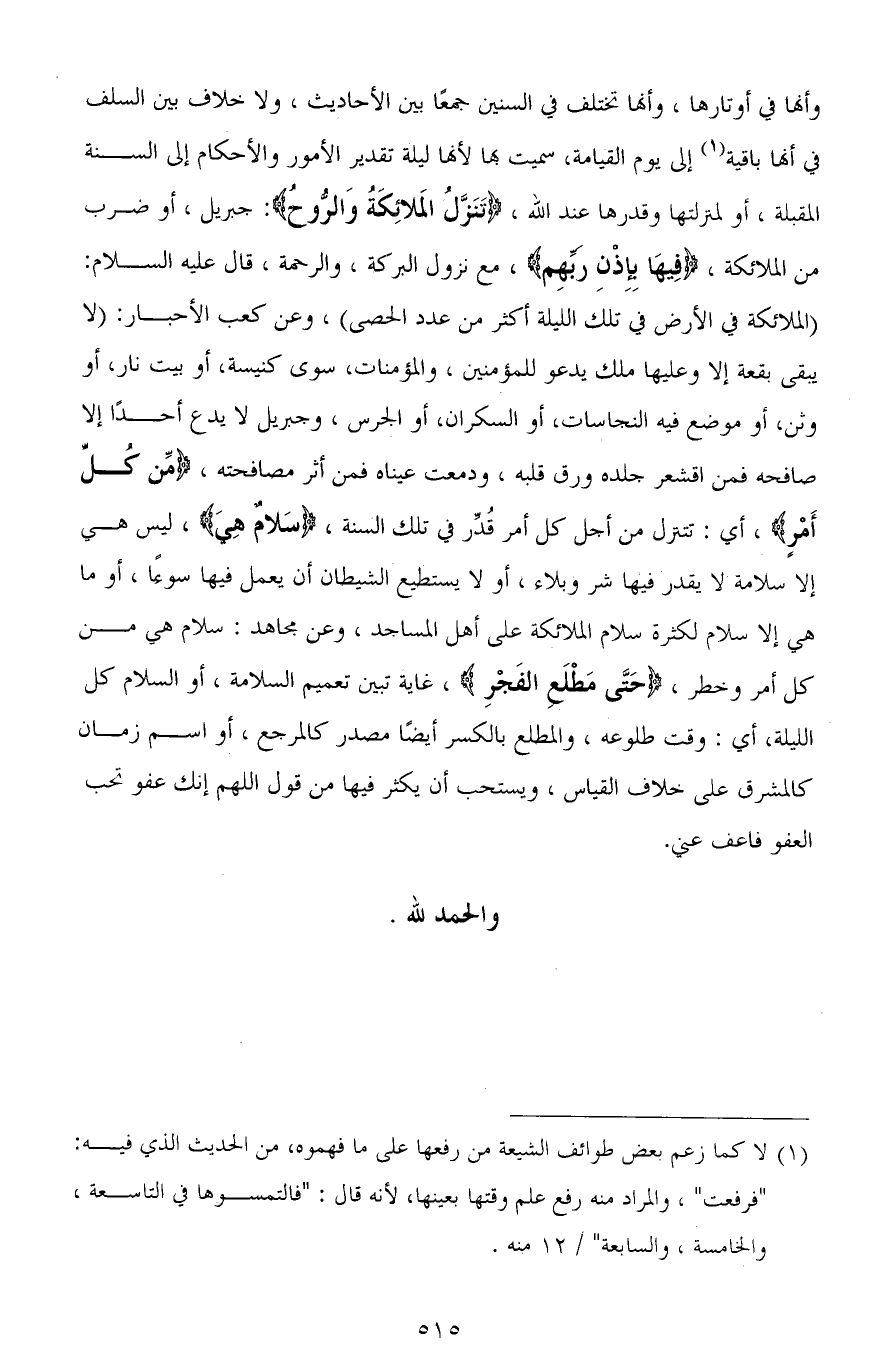 وأنها في أوتارها، وأنَّهَا تختلف في السنين جمعًا بين الأحاديث، ولا خلاف بين السلف في أنها باقية إلى يوم القيامة، سميت بها لأنها ليلة تقدير الأمور والأحكام إلى السنة المقبلة، أو لمنزلتها وقدرها عند الله، (تَنَزَّلُ الْمَلَائِكَةُ وَالرُّوحُ): جبريل، أو ضرب من الملائكة، (فِيهَا بِإِذْنِ رَبِّهِمْ)، مع نزول البركة، والرحمة، قال عليه السلام: (الملائكة في الأرض في تلك الليلة أكثر من عدد الحصى)، وعن كعب الأحبار: (لا يبقى بقعة إلا وعليها ملك يدعو للمؤمنين، والمؤمنات، سوى كنيسة، أو بيت نار، أو وثن، أو موضع فيه النجاسات، أو السكران، أو الجرس، وجبريل لا يدع أحدًا إلا صافحه فمن اقشعر جلده ورق قلبه، ودمعت عيناه فمن أثر مصافحته، (مِنْ كُلِّ أَمْرٍ)، أي: تتنزل من أجل كل أمر قُدِّر في تلك السنة، (سَلامٌ هِيَ)، ليس هي إلا سلامة لا يقدر فيها شر وبلاء، أو لا يستطيع الشيطان أن يعمل فيها سوءًا، أو ما هي إلا سلام لكثرة سلام الملائكة على أهل المساجد، وعن مجاهد: سلام هي من كل أمر وخطر، (حَتَّى مَطْلَعِ الْفَجْرِ)، غاية تبين تعميم السلامة، أو السلام كل الليلة، أي: وقت طلوعه، والمطلِع بالكسر أيضًا مصدر كالمرجع، أو اسم زمان كالمشرق على خلاف القياس، ويستحب أن يكثر فيها من قول اللهم إنك عفو تحب العفو فاعف عني.