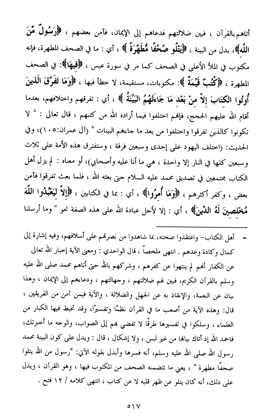 أتاهم بالقرآن، فبين ضلالتهم فدعاهم إلى الإيمان، فآمن بعضهم، (رَسُولٌ مِنَ اللهِ)، بدل من البينة، (يَتْلُو صُحُفًا مُطَهَّرَةً)، أي: ما في الصحف المطهرة، فإنه مكتوب في الملأ الأعلى في الصحف كما مر في سورة عبس، (فيهَا): في الصحف المطهرة، (كُتُبٌ قَيِّمَةٌ): مكتوبات، مستقيمة، لا خطأ فيها، (وَمَا تَفَرَّقَ الَّذِينَ أُوتُوا الْكِتَابَ إِلَّا مِنْ بَعْدِ مَا جَاءَتْهُمُ الْبَيِّنَةُ)، أي: تفرقهم واختلافهم، بعدما أقام الله عليهم الحجج، فإنهم اختلفوا فيما أراده الله من كتبهم، قال تعالى: (وَلَا تَكُونُوا كَالَّذِينَ تَفَرَّقُوا وَاخْتَلَفُوا مِنْ بَعْدِ مَا جَاءَهُمُ الْبَيِّنَاتُ) [آل عمران: 105]، وفي الحديث: (اختلف اليهود على إحدى وسبعين فرقة، وستفترق هذه الأمة على ثلاث وسبعين كلها في النار إلا واحدة، هي ما أنا عليه وأصحابي)، أو معناه: لم يزل أهل الكتاب مجتمعين في تصديق محمد عليه السلام حتى بعثه الله، فلما بعث تفرقوا فآمن بعض، وكفر أكثرهم، (وَمَا أُمِرُوا)، أي: بما في الكتابين، (إِلَّا لِيَعْبُدُوا اللهَ مُخْلِصِينَ لَهُ الدِّينَ)، أي: إلا لأجل عبادة الله على هذه الصفة نحو (وَمَا أَرْسَلْنَا