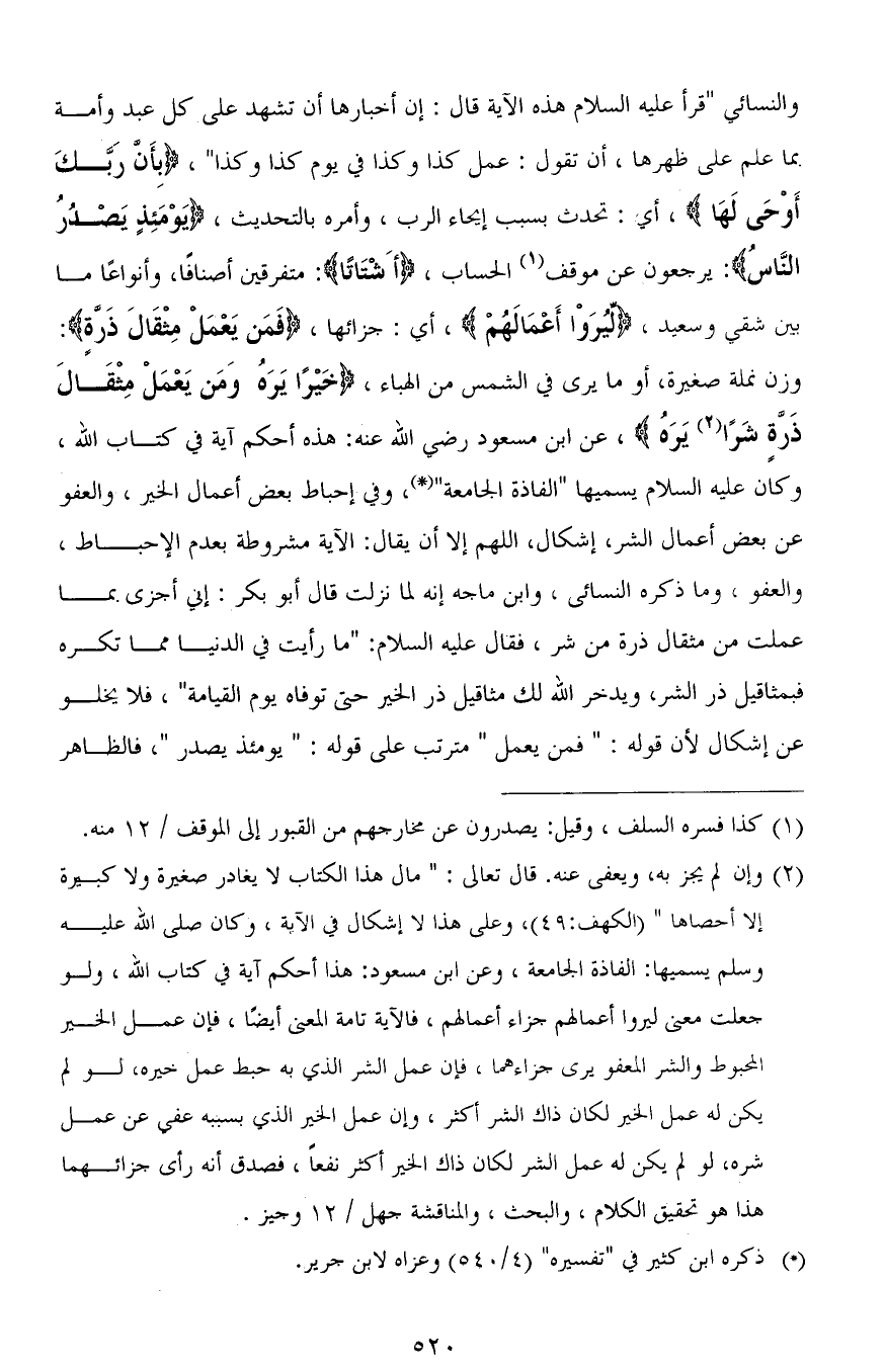 والنسائي " قرأ عليه السلام هذه الآية قال: إن أخبارها أن تشهد على كل عبد وأمة بما عمل على ظهرها، أن تقول: عمل كذا وكذا في يوم كذا وكذا "، (بِأَنَّ رَبَّكَ أَوْحَى لَهَا)، أي: تحدث بسبب إيحاء الرب، وأمره بالتحديث، (يَوْمَئِذٍ يَصْدُرُ النَّاسُ): يرجعون عن موقف الحساب، (أَشْتَاتًا): متفرقين أصنافًا، وأنواعًا ما بين شقي وسعيد، (ليُرَوْا أَعْمَالَهُمْ)، أي: جزائها، (فَمَنْ يَعْمَلْ مِثْقَالَ ذَرَّةٍ): وزن نملة صغيرة، أو ما يرى في الشمس من الهباء، (خَيْرًا يَرَهُ وَمَنْ يَعْمَلْ مِثْقَالَ ذَرَّةٍ شَرًّا يَرَهُ)، عن ابن مسعود رضي الله عنه: هذه أحكم آية في كتاب الله، وكان عليه السلام يسميها " الفاذة الجامعة "، وفي إحباط بعض أعمال الخير، والعفو عن بعض أعمال الشر، إشكال، اللهم إلا أن يقال: الآية مشروطة بعدم الإحباط، والعفو، وما ذكره النسائي، وابن ماجه إنه لما نزلت قال أبو بكر: إني أجزى بما عملت من مثقال ذرة من شر، فقال عليه السلام: " ما رأيت في الدنيا مما تكره فبمثاقيل ذر الشر، ويدخر الله لك مثاقيل ذر الخير حتى توفاه يوم القيامة "، فلا يخلو عن إشكال لأن قوله: " فمن يعمل " مترتب على قوله: " يَوْمَئِذٍ يَصْدُرُ "، فالظاهر