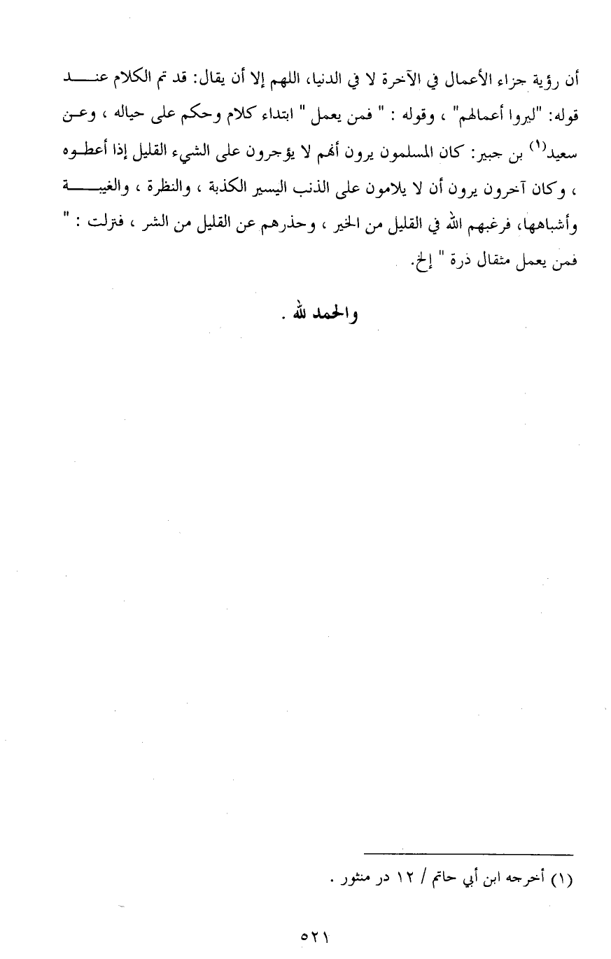 أن رؤية جزاء الأعمال في الآخرة لا في الدنيا، اللهم إلا أن يقال: قد تم الكلام عند قوله: " ليروا أعمالهم "، وقوله: " فمن يعمل " ابتداء كلام وحكم على حياله، وعن سعيد بن جبير: كان المسلمون يرون أنَّهم لا يؤجرون على الشيء القليل إذا أعطوه، وكان آخرون يرون أن لا يلامون على الذنب اليسير الكذبة، والنظرة، والغيبة وأشباهها، فرغبهم الله في القليل من الخير، وحذرهم عن القليل من الشر، فنزلت: (فَمَنْ يَعْمَلْ مِثْقَالَ ذَرَّةٍ) إلخ.