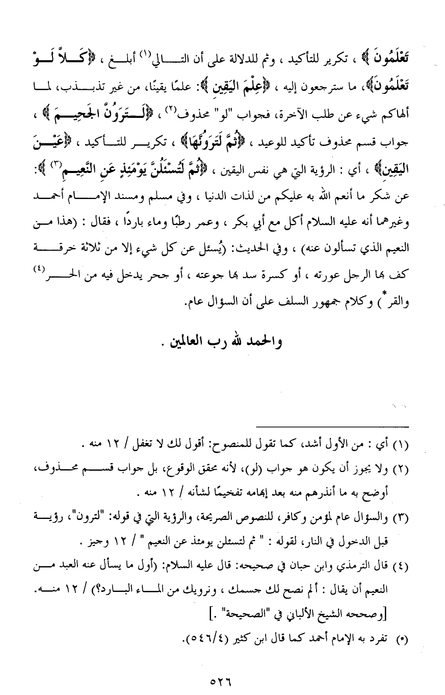 تَعْلَمُونَ)، تكرير للتأكيد، وثم للدلالة على أن التالي أبلغ، (كَلَّا لَوْ تَعْلَمُونَ)، ما سترجعون إليه، (عِلْمَ اليَقِينِ): علمًا يقينًا، من غير تذبذب، لما ألهاكم شيء عن طلب الآخرة، فجواب " لو " محذوف، (لَتَرَوُنَّ الْجَحِيمَ)، جواب قسم محذوف تأكيد للوعيد، (ثُمَّ لَتَرَوُنَّهَا)، تكرير للتأكيد، (عَيْنَ اليَقِينِ)، أي: الرؤية التي هي نفس اليقين، (ثُمَّ لَتُسْأَلُنَّ يَوْمَئِذٍ عَنِ النَّعِيمِ): عن شكر ما أنعم الله به عليكم من لذات الدنيا، وفي مسلم ومسند الإمام أحمد وغيرهما أنه عليه السلام أكل مع أبي بكر، وعمر رطبًا وماء باردًا، فقال: (هذا من النعيم الذي تسألون عنه)، وفي الحديث: (يُسئل عن كل شيء إلا من ثلاثة خرقة كف بها الرجل عورته، أو كسرة سد بها جوعته، أو جحر يدخل فيه من الحر والقر) وكلام جمهور السلف على أن السؤال عام.