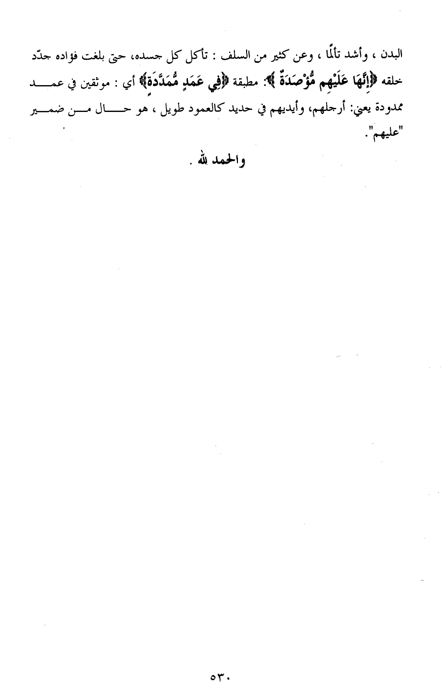البدن، وأشد تألمًا، وعن كثير من السلف: تأكل كل جسده، حتى بلغت فؤاده جدّد خلقه (إِنَّهَا عَلَيْهِمْ مُؤْصَدَةٌ) مطبقة (فِي عَمَدٍ مُمَدَّدَةٍ) أي: موثقين في عمد ممدودة يعني: أرجلهم، وأيديهم في حديد كالعمود طويل، هو حال من ضمير (عليهم).