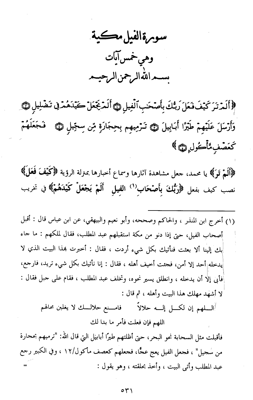 (أَلَمْ تَرَ كَيْفَ فَعَلَ رَبُّكَ بِأَصْحَابِ الْفِيلِ (1) أَلَمْ يَجْعَلْ كَيْدَهُمْ فِي تَضْلِيلٍ (2) وَأَرْسَلَ عَلَيْهِمْ طَيْرًا أَبَابِيلَ (3) تَرْمِيهِمْ بِحِجَارَةٍ مِنْ سِجِّيلٍ (4) فَجَعَلَهُمْ كَعَصْفٍ مَأْكُولٍ (5)