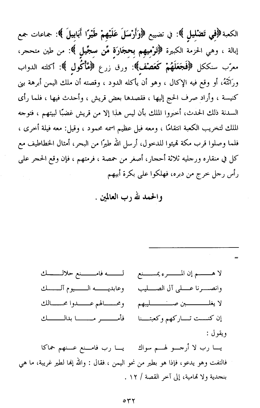 الكعبة (في تَضْلِيلٍ): في تضييع (وَأَرْسَلَ عَلَيْهِمْ طَيْرًا أَبَابِيلَ): جماعات جمع إبالة، وهي الحزمة الكبيرة (تَرْمِيهِمْ بِحِجَارَةٍ مِنْ سِجِّيلٍ): من طين متحجر، معرّب سنككل (فَجَعَلَهُمْ كَعَصْفٍ): َ ورق زرع (مَأْكُولٍ): أكلته الدواب ورَاثَتْهُ، أو وقع فيه الإكال، وهو أن يأكله الدود، وقصته أن ملك اليمن أبرهة بنى كنيسة، وأراد صرف الحج إليها، فقصدها بعض قريش، وأحدث فيها، فلما رأى السدنة ذلك الحدث، أخبروا الملك بأن ليس هذا إلا من قريش غضبًا لبيتهم، فتوجه الملك لتخريب الكعبة انتقامًا، ومعه فيل عظيم اسمه محمود، وقيل: معه فيلة أخرى، فلما وصلوا قرب مكة تهيئوا للدخول، أرسل الله طيرًا من البحر، أمثال الخطاطيف مع كل في منقاره ورجليه ثلاثة أحجار، أصغر من حمصة، فرمتهم، فإن وقع الحجر على رأس رجل خرج من دبره، فهلكوا على بكرة أبيهم.