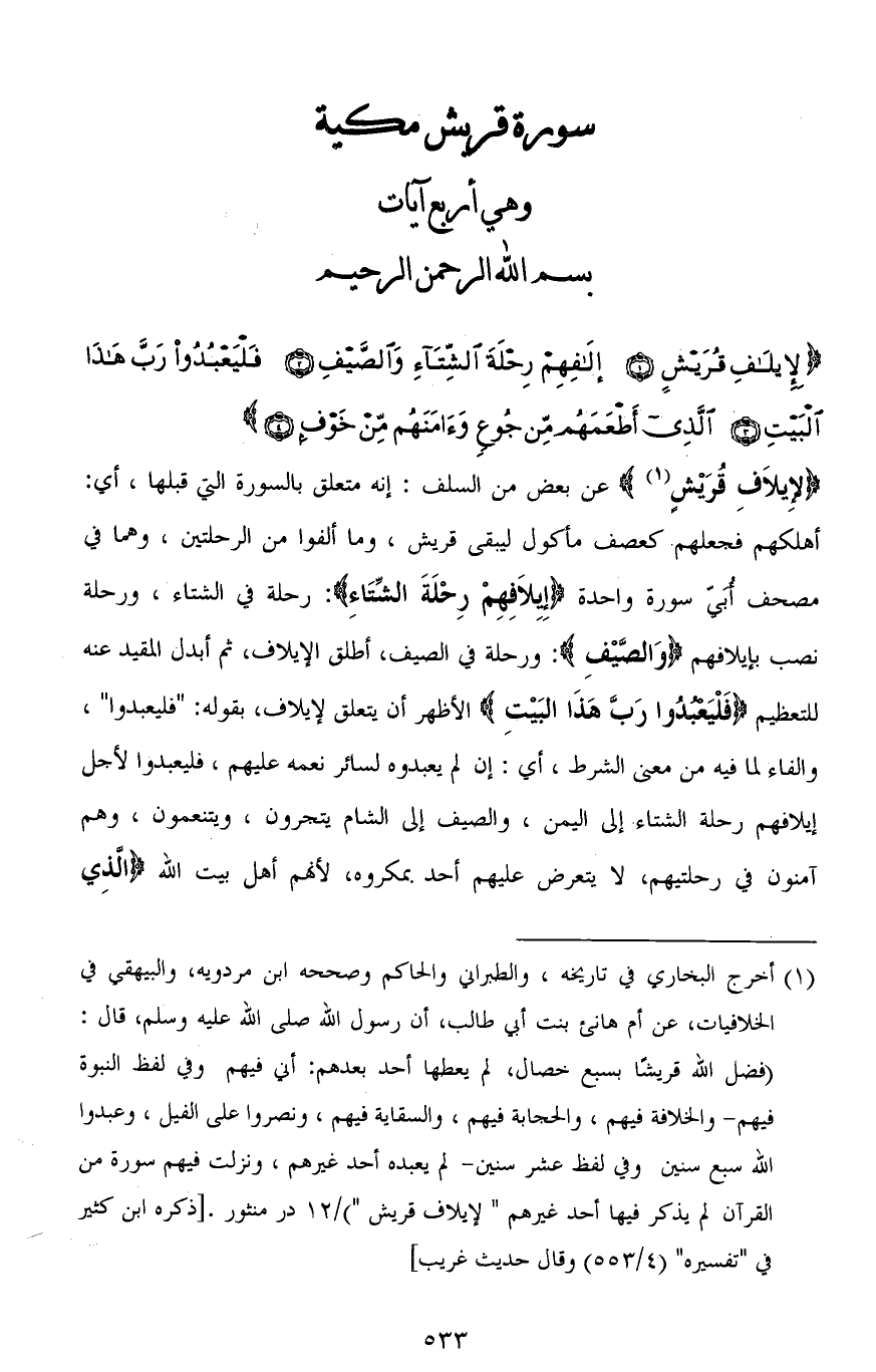 (لِإِيلَافِ قُرَيْشٍ (1) إِيلَافِهِمْ رِحْلَةَ الشِّتَاءِ وَالصَّيْفِ (2) فَلْيَعْبُدُوا رَبَّ هَذَا الْبَيْتِ (3) الَّذِي أَطْعَمَهُمْ مِنْ جُوعٍ وَآمَنَهُمْ مِنْ خَوْفٍ (4)