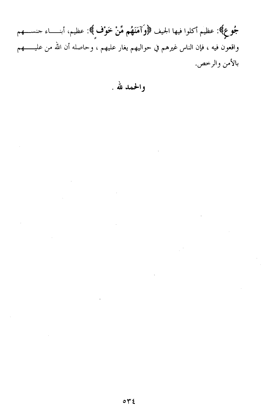 أَطْعَمَهُمْ مِنْ جُوعٍ): عظيم أكلوا فيها الجيف (وَآمَنَهُمْ مِنْ خَوْفٍ): عظيم، أبناء جنسهم واقعون فيه، فإن الناس غيرهم في حواليهم يغار عليهم، وحاصله أن الله مَنَّ عليهم بالأمن والرخص.