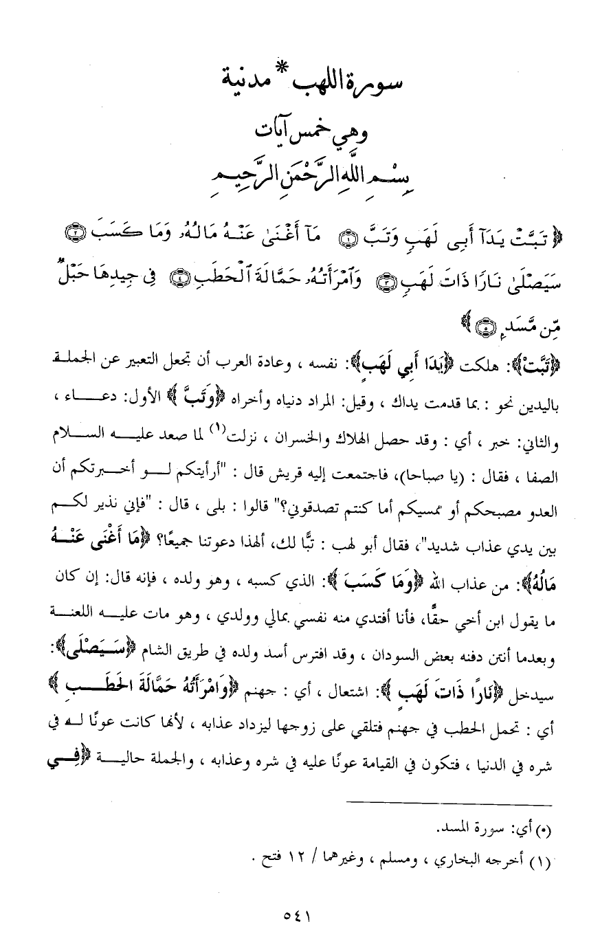 (تَبَّتْ يَدَا أَبِي لَهَبٍ وَتَبَّ (1) مَا أَغْنَى عَنْهُ مَالُهُ وَمَا كَسَبَ (2) سَيَصْلَى نَارًا ذَاتَ لَهَبٍ (3) وَامْرَأَتُهُ حَمَّالَةَ الْحَطَبِ (4) فِي جِيدِهَا حَبْلٌ مِنْ مَسَدٍ (5)