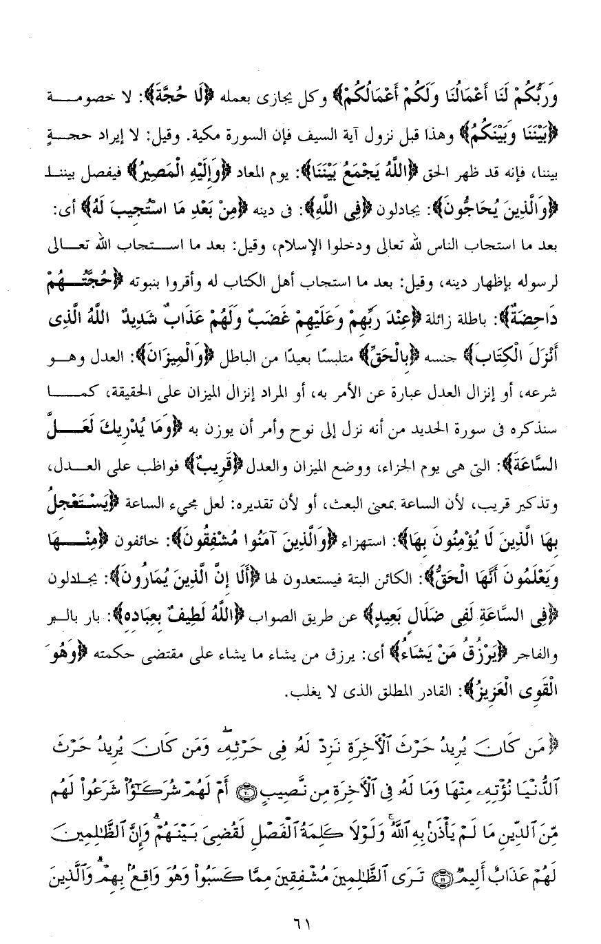 وَرَبُّكُمْ لَنَا أَعْمَالُنَا وَلَكُمْ أَعْمَالُكُمْ) وكل يجازى بعمله (لَا حُجَّةَ): لا خصومة (بَيْنَنَا وَبَيْنَكُمُ) وهذا قبل نزول آية السيف فإن السورة مكية. وقيل: لا إيراد حجةٍ بيننا، فإنه قد ظهر الحق (اللهُ يَجْمَعُ بَيْنَنَا): يوم المعاد (وَإِلَيْهِ الْمَصِيرُ) فيفصل بيننا (وَالَّذِينَ يُحَاجُّونَ): يجادلون (فِى اللهِ): في دينه (مِنْ بَعْدِ مَا اسْتُجِيبَ لَهُ) أي: بعد ما استجاب الناس لله تعالى ودخلوا الإسلام، وقيل: بعد ما استجاب الله تعالى لرسوله بإظهار دينه، وقيل: بعد ما استجاب أهل الكتاب له وأقروا بنبوته (حُجَّتُهُمْ دَاحِضَةٌ): باطلة زائلة (عِنْدَ رَبِّهِمْ وَعَلَيْهِمْ غَضَبٌ وَلَهُمْ عَذَابٌ شَدِيدٌ اللهُ الَّذِي أَنْزَلَ الْكِتَابَ) جنسه (بِالْحَقِّ) متلبسًا بعيدًا من الباطل (وَالْمِيزَانَ): العدل وهو شرعه، أو إنزال العدل عبارة عن الأمر به، أو المراد إنزال الميزان على الحقيقة، كما سنذكره في سورة الحديد من أنه نزل إلى نوح وأمر أن يوزن به (وَمَا يُدْرِيكَ لَعَلَّ السَّاعَةَ): التي هي يوم الجزاء، ووضع الميزان والعدل (قَرِيبٌ) فواظب على العدل، وتذكير قريب، لأن الساعة بمعنى البعث، أو لأن تقديره: لعل مجيء الساعة (يَسْتَعْجِلُ بِهَا الَّذِينَ لَا يُؤْمِنُونَ بِهَا): استهزاء (وَالَّذِينَ آمَنُوا مُشْفِقُونَ): خائفون (مِنْهَا وَيَعْلَمُونَ أَنَّهَا الْحَقُّ): الكائن ألبتَّة فيستعدون لها (أَلَا إِنَّ الَّذِينَ يُمَارُونَ): يجادلون (فِي السَّاعَةِ لَفِي ضَلَالٍ بَعِيدٍ) عن طريق الصواب (اللهُ لَطِيفٌ بِعِبَادِهِ): بار بالبر والفاجر (يَرْزُقُ مَنْ يَشَاءُ) أي: يرزق من يشاء ما يشاء على مقتضى حكمته (وَهُوَ الْقَوِيُّ الْعَزِيزُ): القادر المطلق الذي لا يغلب.