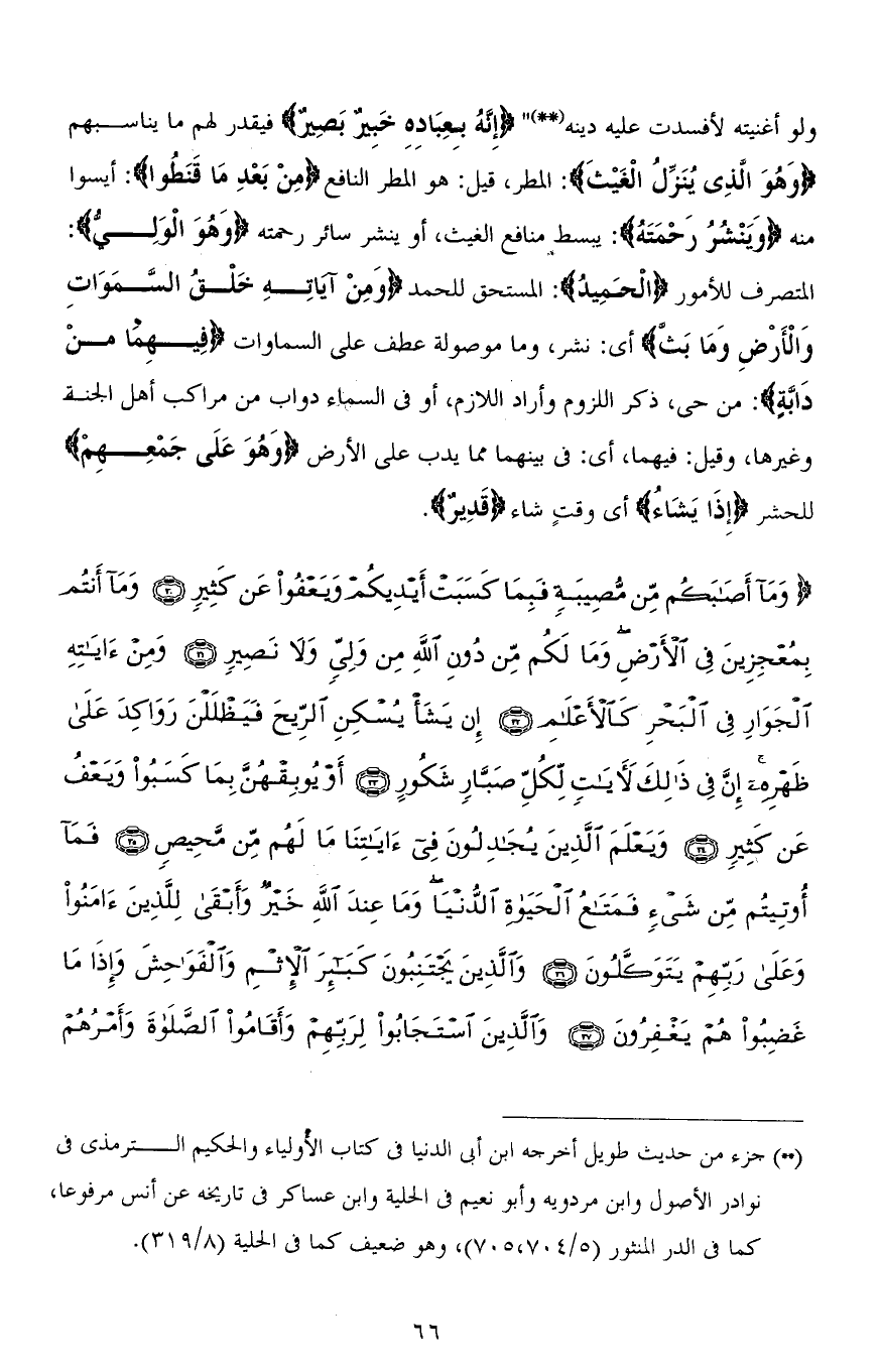 ولو أغنيته لأفسدت عليه دينه " (إِنَّهُ بِعِبَادِهِ خَبِيرٌ بَصِيرٌ) فيقدر لهم ما يناسبهم (وَهُوَ الَّذِى يُنَزِّلُ الْغَيْثَ): المطر، قيل: هو المطر النافع (مِنْ بَعْدِ مَا قَنَطُوا): أيسوا منه (وَيَنشُرُ رَحْمَتَهُ): يبسط منافع الغيث، أو ينشر سائر رحمته (وَهُوَ الْوَلِيُّ): المتصرف للأمور (الْحَمِيدُ): المستحق للحمد (وَمِنْ آيَاتِهِ خَلْقُ السَّمَاوَاتِ وَالْأَرْضِ وَمَا بَثَّ) أي: نشر، وما موصولة عطف على السماوات (فِيهِمَا مِنْ دَابَّةٍ): من حي، ذكر اللزوم وأراد اللازم، أو في السماء دواب من مراكب أهل الجنة وغيرها، وقيل: فيهما، أي: في بينهما يدب على الأرض (وَهُوَ عَلَى جَمْعِهِمْ) للحشر (إِذَا يَشَاءُ) أي وقتٍ شاء (قَدِيرٌ).