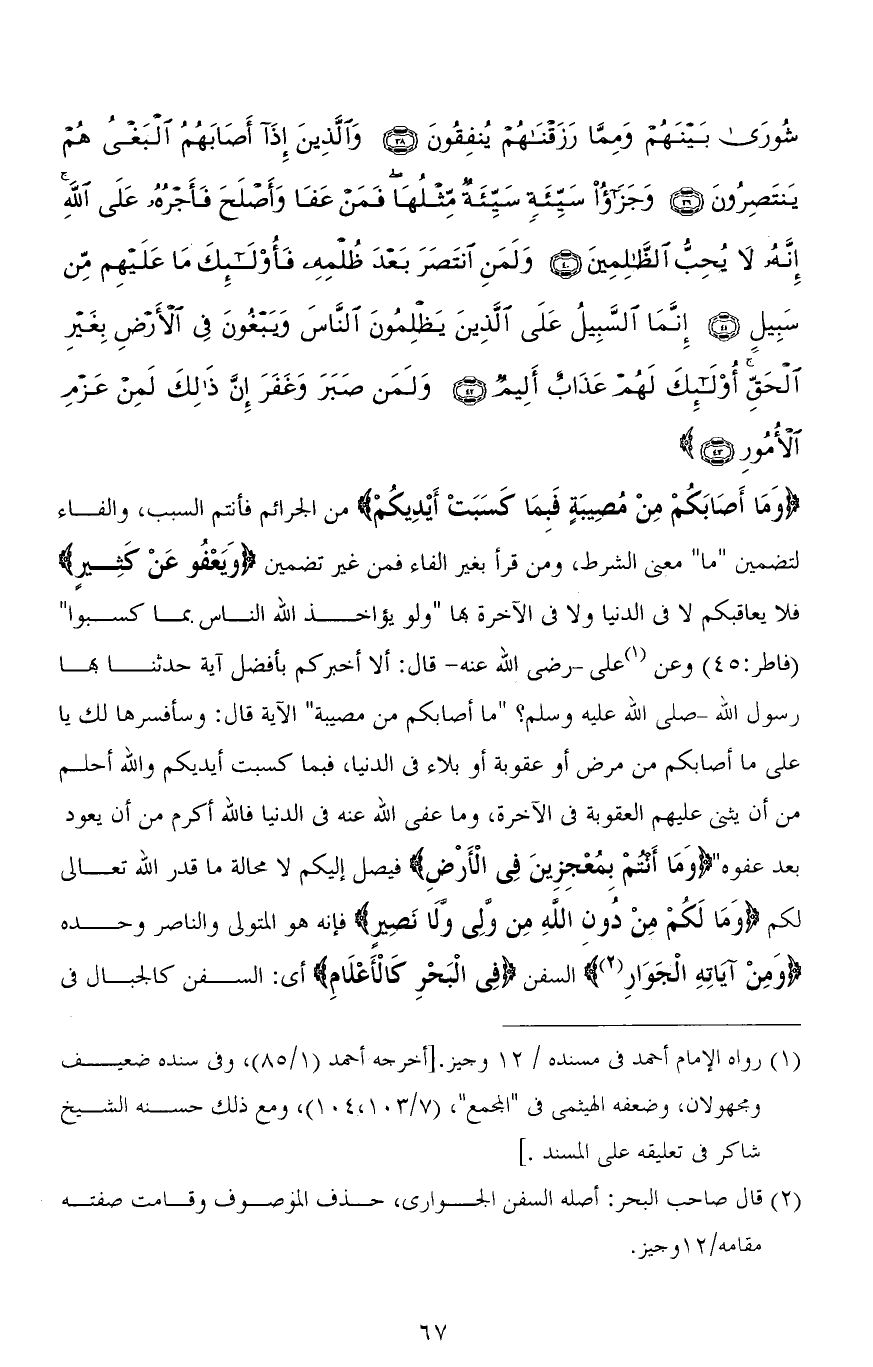 شُورَى بَيْنَهُمْ وَمِمَّا رَزَقْنَاهُمْ يُنْفِقُونَ (38) وَالَّذِينَ إِذَا أَصَابَهُمُ الْبَغْيُ هُمْ يَنْتَصِرُونَ (39) وَجَزَاءُ سَيِّئَةٍ سَيِّئَةٌ مِثْلُهَا فَمَنْ عَفَا وَأَصْلَحَ فَأَجْرُهُ عَلَى اللهِ إِنَّهُ لَا يُحِبُّ الظَّالِمِينَ (40) وَلَمَنِ انْتَصَرَ بَعْدَ ظُلْمِهِ فَأُولَئِكَ مَا عَلَيْهِمْ مِنْ سَبِيلٍ (41) إِنَّمَا السَّبِيلُ عَلَى الَّذِينَ يَظْلِمُونَ النَّاسَ وَيَبْغُونَ فِي الْأَرْضِ بِغَيْرِ الْحَقِّ أُولَئِكَ لَهُمْ عَذَابٌ أَلِيمٌ (42) وَلَمَنْ صَبَرَ وَغَفَرَ إِنَّ ذَلِكَ لَمِنْ عَزْمِ الْأُمُورِ (43)