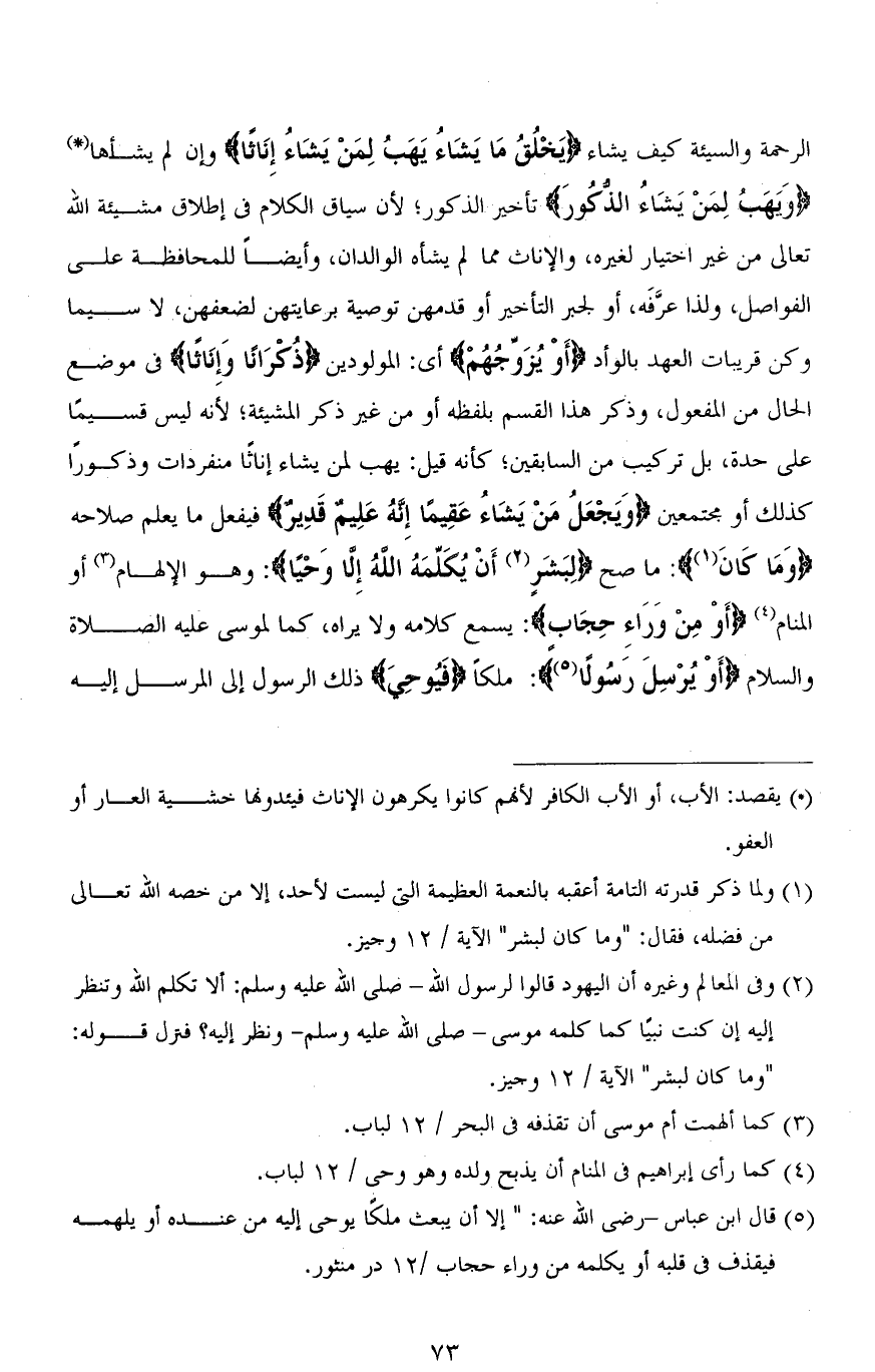 الرحمة والسيئة كيف يشاء (يَخْلُقُ مَا يَشَاءُ يَهَبُ لِمَنْ يَشَاءُ إِنَاثًا) وإن لم يشأها (1) (وَيَهَبُ لِمَنْ يَشَاءُ الذكورَ) تأخير الذكور؛ لأن سياق الكلام في إطلاق مشيئة الله تعالى من غير اختيار لغيره، والإناث مما لم يشأه الوالدان، وأيضًا للمحافظة على الفواصل، ولذا عرَّفَه، أو لجبر التأخير أني قدمهن توصية برعايتهن لضعفهن، لا سيما وكُنَّ قريبات العهد بالوأد (أَوْ يُزَوِّجُهُمْ) أي: المولودين (ذُكْرَانًا وَإِنَاثًا) في موضع الحال من المفعول، وذكر هذا القسم بلفظه أو من غير ذكر المشيئة؛ لأنه ليس قسيمًا على حدة، بل تركيب من السابقين؛ كأنه قيل: يهب لمن يشاء إناثًا منفردات وذكورًا كذلك أو مجتمعين (وَيَجْعَلُ مَنْ يَشَاءُ عَقِيمًا إِنَّهُ عَلِيمٌ قَدِي) فيفعل ما يعلم صلاحه (وَمَا كانَ): ما صح (لِبَشَرٍ أَنْ يُكَلِّمَهُ اللهُ إِلى وَحْيًا): وهو الإلهام أو المنام (أَوْ مِنْ وَرَاءِ حِجَابٍ): يسمع كلامه ولا يراه، كما لموسى عليه الصلاة والسلام (أَوْ يُرْسِلَ رَسُولًا): ملكًا (فيُوحِيَ) ذلك الرسول إلي المرسل إليه