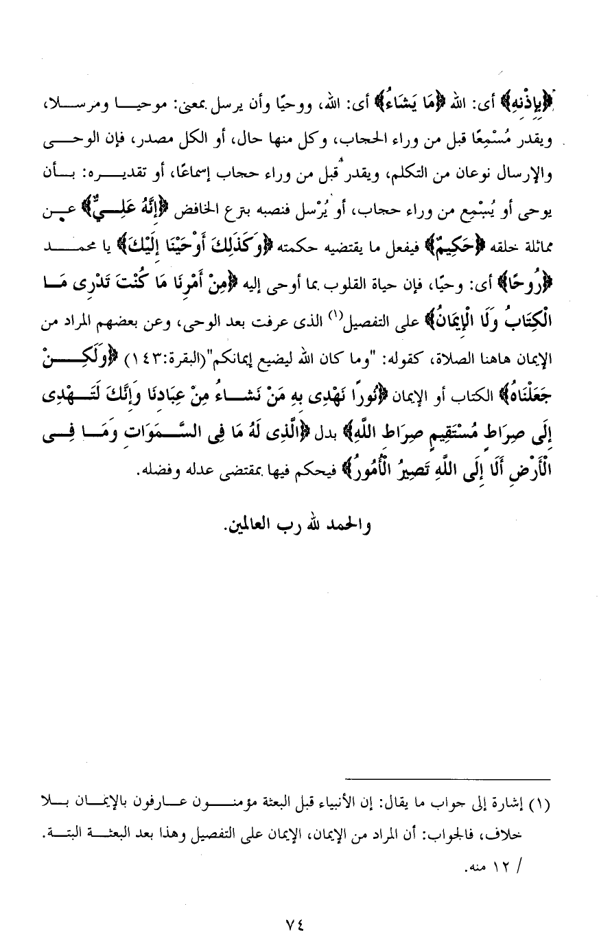 (بِإِذْنِهِ) أي: الله (مَا يَشَاءُ) أي: الله، ووحيًا وأن يرسل بمعنى: موحيًا ومرسلاً، ويقدر مُسْمِعًا قبل من وراء الحجاب، وكل منها حال، أو الكل مصدر، فإن الوحي والإرسال نوعان من التكلم، ويقدر قبل من وراء حجاب إسماعًا، أو تقديره: بأن يوحي أو يُسمِع من وراء حجاب، أو يُرْسل فنصبه بنزع الخافض (إِنَّهُ عَلِيٌّ) عن مماثلة خلقه (حَكِيمٌ) فيفعل ما يقتضيه حكمته (وَكَذَلِكَ أَوْحَيْنَا إِلَيْكَ) يا محمد (رُوحًا) أي: وحيًا، فإن حياة القلوب بما أوحى إليه (مِنْ أَمْرِنَا مَا كُنْتَ تَدْرِى مَا الْكِتَابُ وَلَا الْإِيمَانُ) على التفصيل الذي عرفت بعد الوحي، وعن بعضهم المراد من الإيمان ها هنا الصلاة، كقوله: " وما كان الله ليضيع إيمانكم " [البقرة: 143] (وَلَكِن جَعَلْنَاهُ) الكتاب أو الإيمان (نُورًا نَهْدِي بِهِ مَنْ نَشَاءُ مِنْ عِبَادِنَا وَإِنَّكَ لَتَهْدِي إِلَى صِرَاطٍ مُسْتَقِيمٍ صِرَاطِ اللهِ) بدل (الَّذِي لَهُ مَا فِي السَّمَاوَاتِ وَمَا فِي الْأَرْضِ أَلَا إِلَى اللهِ تَصِيرُ الْأُمُورُ) فيحكم فيها بمقتضى عدله وفضله.