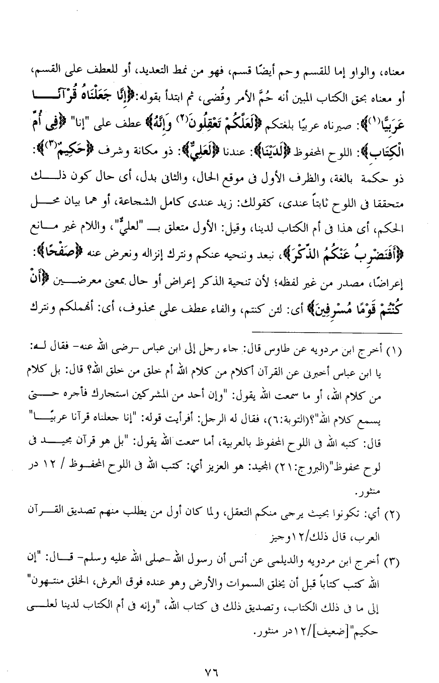 معناه، والواو إما للقسم وحم أيضًا قسم، فهو من نمط التعديد، أو للعطف على القسم، أو معناه بحق الكتاب المبين أنه حُمَّ الأمر وقُضي، ثم ابتدأ بقوله: (إِنَّا جَعَلْنَاهُ قُرْآنًا عَرَبِيًّا): صيرناه عربيًا بلغتكم (لَعَلَّكُمْ تَعْقِلُونَ وَإِنَّهُ) عطف على " إنا " (فِي أُمِّ الْكِتَابِ): اللوح المحفوظ (لَدَيْنَا): عندنا (لَعَلِيٌّ): ذو مكانة وشرف (حَكِيمٌ): ذو حكمة بالغة، والظرف الأول في موقع الحال، والثاني بدل، أي حال كون ذلك متحققا في اللوح ثابتاً عندي، كقولك: زيد عندي كامل الشجاعة، أو هما بيان محل الحكم، أي هذا في أم الكتاب لدينا، وقيل: الأول متعلق بـ (لَعَلِيٌّ)، واللام غير مانع (أَفَنَضْرِبُ عَنْكُمُ الذِّكرَ)، نبعد وننحيه عنكم ونترك إنزاله ونعرض عنه (صَفْحًا): إعراضًا، مصدر من غير لفظه؛ لأن تنحية الذكر إعراض أو حال بمعنى معرضين (أَنْ كُنْتُمْ قَوْمًا مُسْرِفِينَ) أي: لئن كنتم، والفاء عطف على محذوف، أي: أنهملكم ونترك