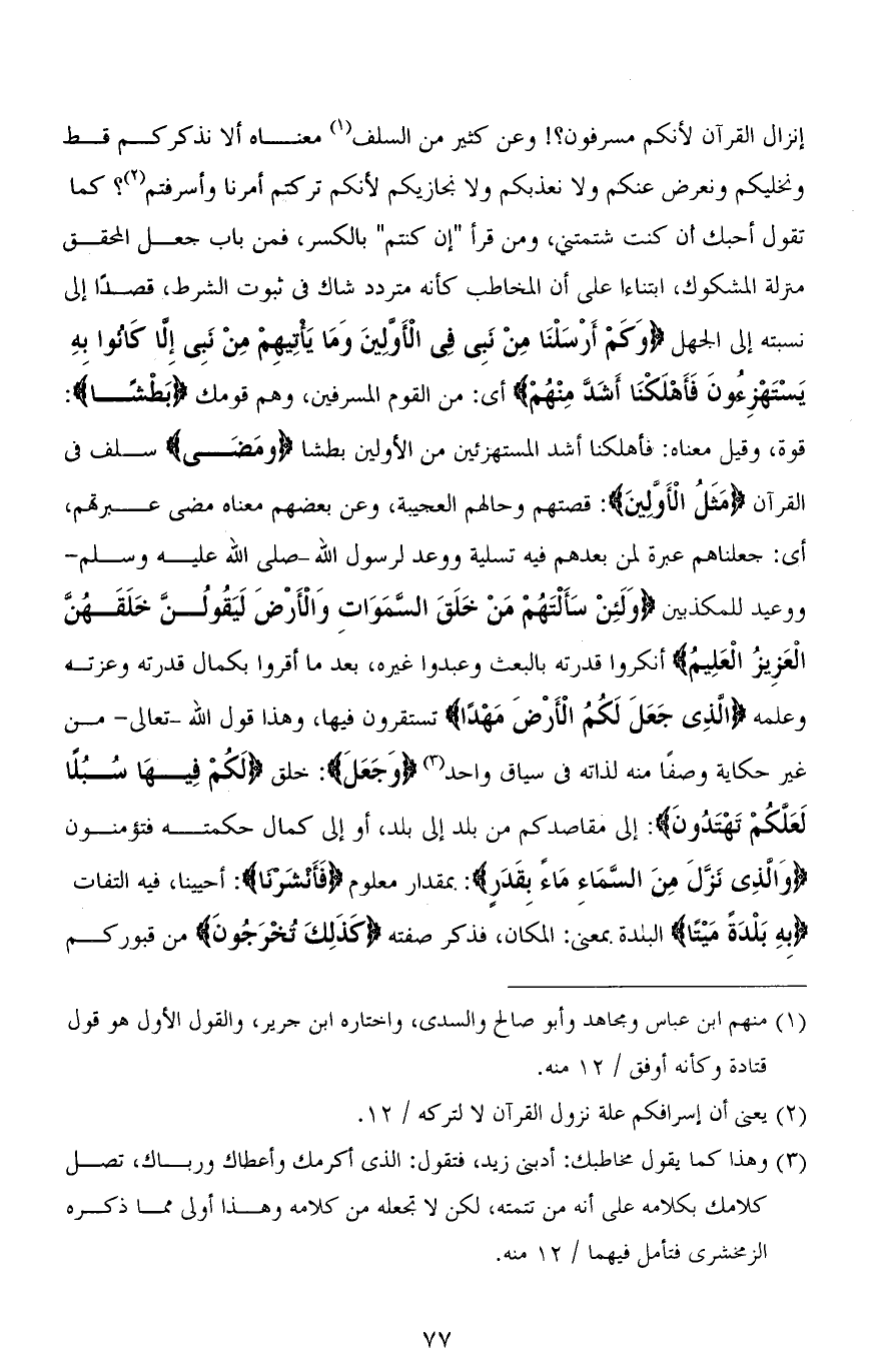 إنزال القرآن لأنكم مسرفون؟! وعن كثير من السلف معناه ألا نذكركم قط ونخليكم ونعرض عنكم ولا نعذبكم ولا نجازيكم لأنكم تركتم أمرنا وأسرفتم؟ كما تقول أحبك أن كنت شتمتني، ومن قرأ " إن كنتم " بالكسر، فمن باب جعل المحقق منزلة المشكوك، ابتناءًا على أن المخاطب كأنه متردد شاك في ثبوت الشرط، قصدًا إلى نسبته إلى الجهل (وَكَمْ أَرْسَلْنَا مِنْ نَبِيٍّ فِي الْأَوَّلِينَ وَمَا يَأْتِيهِمْ مِنْ نَبِيٍّ إِلَّا كَانُوا بِهِ يَسْتَهْزِءُونَ فَأَهْلَكْنَا أَشَدَّ مِنْهُمْ) أي: من القوم المسرفين، وهم قومك (بَطْشًا): قوة، وقيل معناه: فأهلكنا أشد المستهزئين من الأولين بطشًا (ومَضَى) سلف في القرآن (مَثَلُ الْأَوَّلِينَ): قصتهم وحالهم العجيبة، وعن بعضهم معناه مضى عبرتهم، أى: جعلناهم عبرة لمن بعدهم فيه تسلية ووعد لرسول الله - صلى الله عليه وسلم - ووعيد للمكذبين (وَلَئِنْ سَأَلْتَهُمْ مَنْ خَلَقَ السَّمَاوَاتِ وَالْأَرْضَ لَيَقُولُنَّ خَلَقَهُنَّ الْعَزِيزُ الْعَلِيمُ) أنكروا قدرته بالبعث وعبدوا غيره، بعد ما أقروا بكمال قدرته وعزته وعلمه (الَّذِي جَعَلَ لَكُمُ الْأَرْضَ مَهْدًا) تستقرون فيها، وهذا قول الله - تعالى - من غير حكاية وصفًا منه لذاته في سياق واحد (وَجَعَلَ): خلق (لَكُمْ فِيهَا سُبُلًا لَعَلَّكُمْ تَهْتَدُونَ): إلى مقاصدكم من بلد إلى بلد، أو إلى كمال حكمته فتؤمنون (وَالَّذِي نَزَّلَ مِنَ السَّمَاءِ مَاءً بِقَدَرٍ): بمقدار معلوم (فَأَنْشَرْنَا): أحيينا، فيه التفات (بِهِ بَلْدَةً مَيْتًا) البلدة بمعنى: المكان، فذكر صفته (كَذَلِكَ تُخْرَجُونَ) من قبوركم