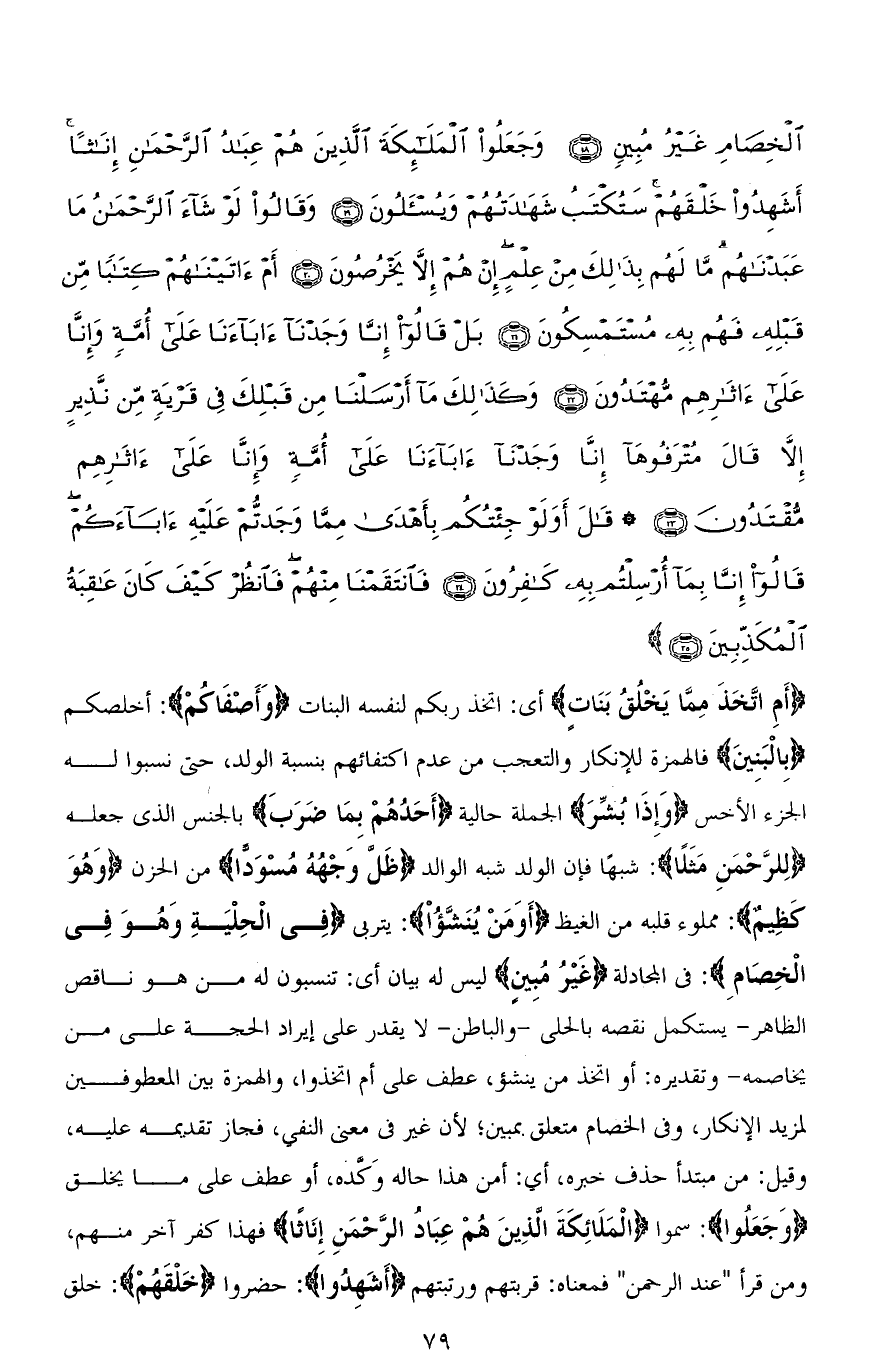 الْخِصَامِ غَيْرُ مُبِينٍ (18) وَجَعَلُوا الْمَلَائِكَةَ الَّذِينَ هُمْ عِبَادُ الرَّحْمَنِ إِنَاثًا أَشَهِدُوا خَلْقَهُمْ سَتُكْتَبُ شَهَادَتُهُمْ وَيُسْأَلُونَ (19) وَقَالُوا لَوْ شَاءَ الرَّحْمَنُ مَا عَبَدْنَاهُمْ مَا لَهُمْ بِذَلِكَ مِنْ عِلْمٍ إِنْ هُمْ إِلَّا يَخْرُصُونَ (20) أَمْ آتَيْنَاهُمْ كِتَابًا مِنْ قَبْلِهِ فَهُمْ بِهِ مُسْتَمْسِكُونَ (21) بَلْ قَالُوا إِنَّا وَجَدْنَا آبَاءَنَا عَلَى أُمَّةٍ وَإِنَّا عَلَى آثَارِهِمْ مُهْتَدُونَ (22) وَكَذَلِكَ مَا أَرْسَلْنَا مِنْ قَبْلِكَ فِي قَرْيَةٍ مِنْ نَذِيرٍ إِلَّا قَالَ مُتْرَفُوهَا إِنَّا وَجَدْنَا آبَاءَنَا عَلَى أُمَّةٍ وَإِنَّا عَلَى آثَارِهِمْ مُقْتَدُونَ (23) قَالَ أَوَلَوْ جِئْتُكُمْ بِأَهْدَى مِمَّا وَجَدْتُمْ عَلَيْهِ آبَاءَكُمْ قَالُوا إِنَّا بِمَا أُرْسِلْتُمْ بِهِ كَافِرُونَ (24) فَانْتَقَمْنَا مِنْهُمْ فَانْظُرْ كَيْفَ كَانَ عَاقِبَةُ الْمُكَذِّبِينَ (25)
