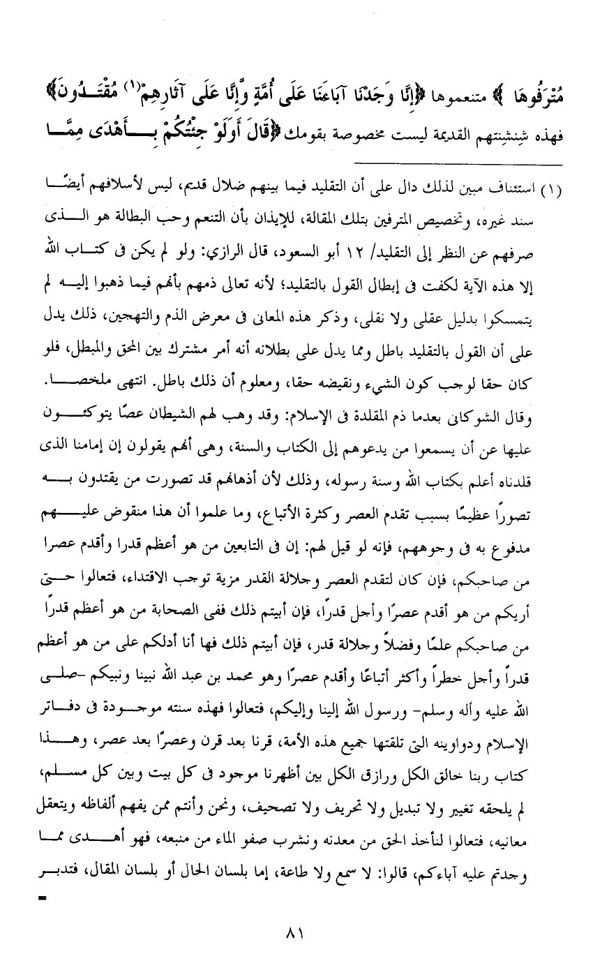 مُتْرَفُوهَا) متنعموها (إِنَّا وَجَدْنَا آبَاءَنَا عَلَى أُمَّةٍ وَإِنَّا عَلَى آثَارِهِمْ مُقْتَدُونَ) فهذه شِنشِنتهم القديمة ليست مخصوصة بقومك (قَالَ أَوَلَوْ جِئْتُكُمْ بِأَهْدَى مِمَّا