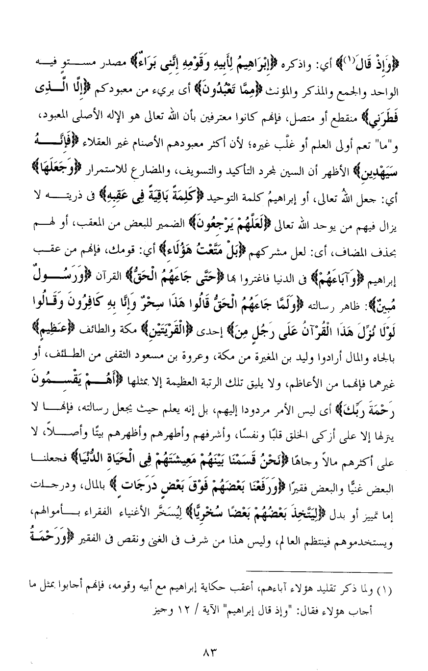 (وإِذْ قَالَ) أي: واذكره (إِبْرَاهِيمُ لِأَبِيهِ وَقَوْمِهِ إِنَّنِي بَرَاءٌ) مصدر مستوٍ فيه الواحد والجمع والمذكر والمؤنث (مِمَّا تَعْبُدُونَ) أي بريء من معبودكم (إِلا الذِي فَطَرَني) منقطع أو متصل، فإنهم كانوا معترفين بأن الله تعالى هو الإله الأصلي المعبود، و (ما) تعم أولي العلم أو غلَّب غيره؛ لأن أكثر معبودهم الأصنام غير العقلاء (فَإِنَّهُ سَيَهْدِينِ) الأظهر أن السين لمجرد التأكيد والتسويف، والمضارع للاستمرار (وَجَعَلَهَا) أي: جعل الله تعالى، أو إبراهيمُ كلمة التوحيد (كَلِمَةً بَاقِيَةً فِي عَقِبِهِ) في ذريته لا يزال فيهم من يوحد الله تعالى (لَعَلَّهُمْ يَرْجِعُونَ) الضمير للبعض من العقب، أو لهم بحذف المضاف، أي: لعل مشركهم (بَلْ مَتَّعْتُ هَؤُلَاءِ) أي: قومك، فإنهم من عقب إبراهيم (وَآبَاءَهُمْ) في الدنيا فاغتروا بها (حَتَّى جَاءَهُمُ الْحَقُّ) القرآن (وَرَسُول مُبِينٌ): ظاهر رسالته (وَلَمَّا جَاءَهُمُ الْحَقُّ قَالُوا هَذَا سِحْرٌ وَإِنَّا بِهِ كَافِرُونَ وَقَالُوا لَوْلَا نُزِّلَ هَذَا الْقُرْآنُ عَلَى رَجُلٍ مِنَ) إحدى (الْقَرْيَتَيْنِ) مكة والطائف (عَظِيمٍ) بالجاه والمال أرادوا [الوليد] بن المغيرة من مكة، وعروة بن مسعود الثقفي من الطائف، أو غيرهما فإنهما من الأعاظم، ولا يليق تلك الرتبة العظيمة إلا بمثلهما (أَهُمْ يَقْسِمُونَ رَحْمَتَ رَبِّكَ) أي ليس الأمر مردودًا إليهم، بل إنه يعلم حيث يجعل رسالته، [فإنه] لا ينزلها إلا على أزكى الخلق قلبًا ونفسًا، وأشرفهم وأطهرهم وأظهرهم بيتًا وأصلاً، لا على أكثرهم مالاً وجاهًا (نَحْنُ قَسَمْنَا بَيْنَهُمْ مَعِيشَتَهُمْ فِي الْحَيَاة الدُّنْيَا) فجعلنا البعض غنيًّا والبعض فقيرًا (وَرَفَعْنَا بَعْضَهُمْ فَوْقَ بَعْضٍ دَرَجَاتٍ) بالمال، ودرجات إما تمييز أو بدل (لِيَتَّخِذَ بَعْضُهُمْ بَعْضًا سُخْرِيًّا) لِيُسَخَّر الأغنياء الفقراء بأموالهم، ويستخدموهم فينتظم العالم، وليس هذا من شرف في الغني ونقص في الفقير (وَرَحْمَتُ