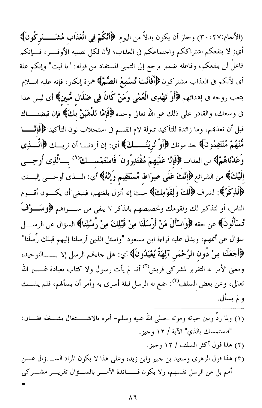 [الأنعام: 27، 30] وجاز أن يكون بدلاً من اليوم (أنَّكُمْ فِي الْعَذَابِ مُشْتَرِكُونَ) أي: لا ينفعكم اشتراككم واجتماعكم في العذاب؛ لأن لكل نصيبه الأوفر، فإنكم فاعلُ لن ينفعكم، وفاعله ضمير يرجع إلى التمني المستفاد من قوله: " يا ليت " وإنكم علة أى لأنكم في العذاب مشتركون (أَفَأَنْتَ تُسْمِعُ الصُّمَّ) همزة الإنكار، فإنه عليه السلام يتعب روحه في إهدائهم (أَوْ تَهْدِي الْعُمْيَ وَمَنْ كَانَ فِي ضَلَالٍ مُبِينٍ) أي ليس هذا في وسعك، والقادر على ذلك هو الله تعالى وحده (فَإِمَّا نَذْهَبَنَّ بِكَ) فإن قبضناك قبل أن نعذبهم، وما زائدة للتأكيد بمنزلة لام القسم في استجلاب نون التأكيد (فَإِنَّا مِنْهُمْ مُنْتَقِمُونَ) بعد موتك (أَوْ نُرِيَنَّكَ) أي: إن أردنا أن نريك (الَّذِي وَعَدْنَاهُمْ) من العذاب (فَإِنَّا عَلَيْهِمْ مُقْتَدِرُونَ فَاسْتَمْسِكْ بِالَّذِي أُوحِيَ إِلَيْكَ) من الشرائع (إِنَّكَ عَلَى صِرَاطٍ مُسْتَقِيمٍ وَإِنَّهُ) أي: الذي أوحي إليك (لَذِكرٌ): لشرف (لَكَ وَقِوْمِكَ) حيث إنه أنزل بلغتهم، فينبغي أن يكون أقوم الناس، أو لتذكير لك ولقومك وتخصيصهم بالذكر لا ينفي من سواهم (وَسَوْفَ تُسْأَلُونَ) عن حقه (وَاسْأَلْ مَنْ أَرْسَلْنَا مِنْ قَبْلِكَ مِنْ رُسُلِنَا) السؤال عن الرسل سؤال عن أممهم، ويدل عليه قراءة ابن مسعود " واسئل الذين أرسلنا إليهم قبلك رُسلَنا " (أَجَعَلْنَا مِنْ دُونِ الرَّحْمَنِ آلِهَةً يُعْبَدُونَ) أي: هل جاءتهم الرسل إلا بالتوحيد، ومعنى الأمر به التقرير لمشركي قريش أنه لم يأت رسول ولا كتاب بعبادة غير الله تعالى، وعن بعض السلف: جمع له الرسل ليلة أسري به وأمر أن يسألهم، فلم يشك ولم يسأل.