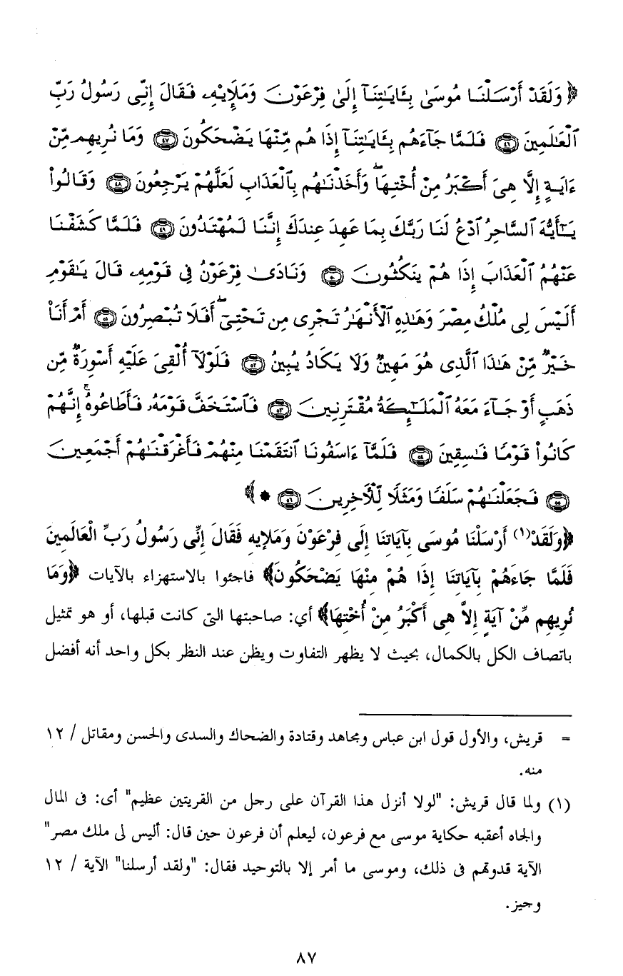 (وَلَقَدْ أَرْسَلْنَا مُوسَى بِآيَاتِنَا إِلَى فِرْعَوْنَ وَمَلَإِهِ فَقَالَ إِنِّي رَسُولُ رَبِّ الْعَالَمِينَ (46) فَلَمَّا جَاءَهُمْ بِآيَاتِنَا إِذَا هُمْ مِنْهَا يَضْحَكُونَ (47) وَمَا نُرِيهِمْ مِنْ آيَةٍ إِلَّا هِيَ أَكْبَرُ مِنْ أُخْتِهَا وَأَخَذْنَاهُمْ بِالْعَذَابِ لَعَلَّهُمْ يَرْجِعُونَ (48) وَقَالُوا يَا أَيُّهَ السَّاحِرُ ادْعُ لَنَا رَبَّكَ بِمَا عَهِدَ عِنْدَكَ إِنَّنَا لَمُهْتَدُونَ (49) فَلَمَّا كَشَفْنَا عَنْهُمُ الْعَذَابَ إِذَا هُمْ يَنْكُثُونَ (50) وَنَادَى فِرْعَوْنُ فِي قَوْمِهِ قَالَ يَا قَوْمِ أَلَيْسَ لِي مُلْكُ مِصْرَ وَهَذِهِ الْأَنْهَارُ تَجْرِي مِنْ تَحْتِي أَفَلَا تُبْصِرُونَ (51) أَمْ أَنَا خَيْرٌ مِنْ هَذَا الَّذِي هُوَ مَهِينٌ وَلَا يَكَادُ يُبِينُ (52) فَلَوْلَا أُلْقِيَ عَلَيْهِ أَسْوِرَةٌ مِنْ ذَهَبٍ أَوْ جَاءَ مَعَهُ الْمَلَائِكَةُ مُقْتَرِنِينَ (53) فَاسْتَخَفَّ قَوْمَهُ فَأَطَاعُوهُ إِنَّهُمْ كَانُوا قَوْمًا فَاسِقِينَ (54) فَلَمَّا آسَفُونَا انْتَقَمْنَا مِنْهُمْ فَأَغْرَقْنَاهُمْ أَجْمَعِينَ (55) فَجَعَلْنَاهُمْ سَلَفًا وَمَثَلًا لِلْآخِرِينَ (56)