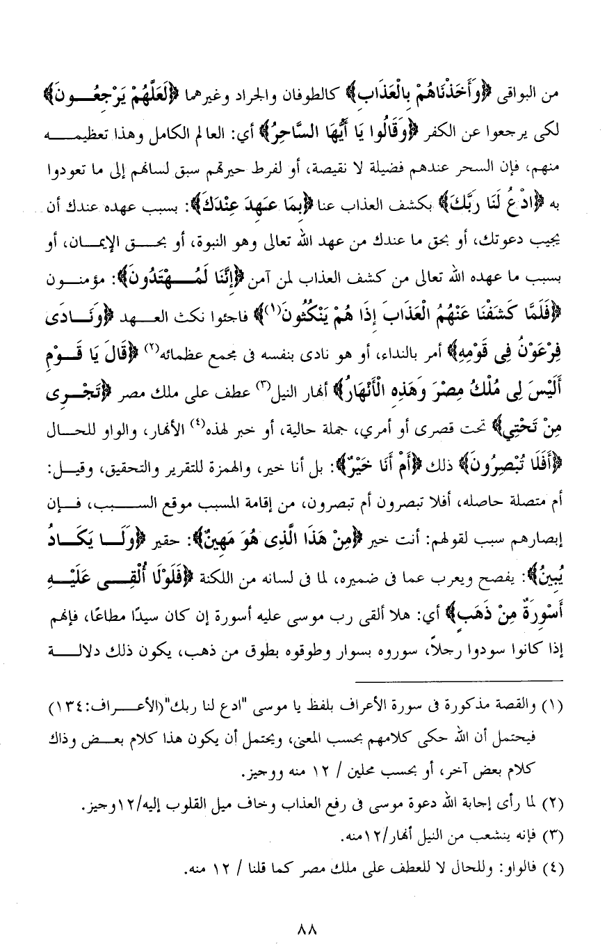 من البواقي (وَأَخَذْنَاهُمْ بِالْعَذَاب) كالطوفان والجراد وغيرهما (لَعَلَّهُمْ يَرْجِعُونَ) لكي يرجعوا عن الكفر (وَقَالُوا يَا أَيُّهَ السَّاحِرُ) أي: العالم الكامل وهذا تعظيمه منهم، فإن السحر عندهم فضيلة لا نقيصة، أو لفرط حيرتهم سبق لسانهم إلى ما تعودوا به (ادْعُ لَنَا رَبَّكَ) بكشف العذاب عنا (بِمَا عَهِدَ عِنْدَكَ): بسبب عهده عندك أن يجيب دعوتك، أو بحق ما عندك من عهد الله تعالى وهو النبوة، أو بحق الإيمان، أو بسبب ما عهده الله تعالى من كشف العذاب لمن آمن (إِنَّنَا لَمُهْتَدُونَ): مؤمنون (فَلَمَّا كَشَفْنَا عَنْهُمُ الْعَذَابَ إِذَا هُمْ يَنْكُثُونَ) فاجئوا نكث العهد (وَنَادَى فِرْعَوْنُ فِي قَوْمِهِ) أمر بالنداء، أو هو نادى بنفسه في مجمع عظمائه (قَالَ يَا قَوْمِ أَلَيْسَ لِي مُلْكُ مِصْرَ وَهَذِهِ الْأَنْهَارُ) أنهار النيل عطف على ملك مصر (تَجْرِي مِنْ تَحْتِي) تحت قصري أو أمري، جملة حالية، أو خبر لهذه الأنهار، والواو للحال (أَفَلَا تُبْصِرُونَ) ذلك (أَمْ أَنَا خَيْرٌ): بل أنا خير، والهمزة للتقرير والتحقيق، وقيل: أم متصلة حاصله، أفلا تبصرون أم تبصرون، من إقامة المسبب موقع السبب، فإن إبصارهم سبب لقولهم: أنت خير (مِنْ هَذَا الَّذِى هُوَ مَهِينٌ): حقير (وَلَا يَكَادُ يُبِينُ): يفصح ويعرب عما في ضميره، لما في لسانه من اللكنة (فَلَوْلَا أُلْقِيَ عَلَيْهِ أَسْوِرَةٌ مِنْ ذَهَبٍ) أي: هلا ألقى رب موسى عليه أسورة إن كان سيدًا مطاعًا، فإنهم إذا كانوا سودوا رجلاً، سوروه بسوار وطوقوه بطوق من ذهب، يكون ذلك دلالة