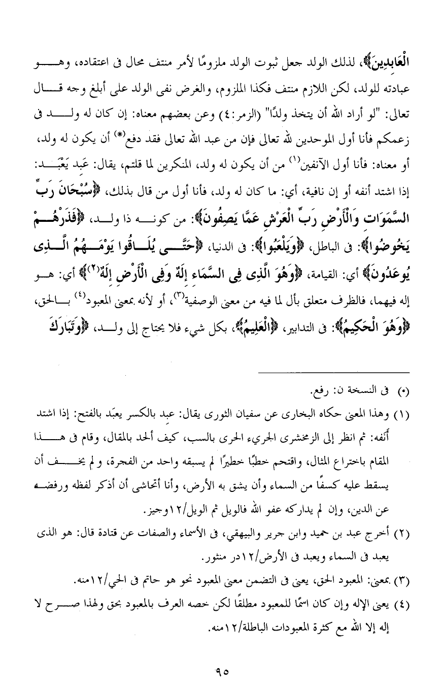 الْعَابِدِينَ)، لذلك الولد جعل ثبوت الولد ملزومًا لأمر منتف محال في اعتقاده، وهو عبادته للولد، لكن اللازم منتف فكذا الملزوم، والغرض نفي الولد على أبلغ وجه قال تعالى: " لو أراد الله أن يتخذ ولدًا " [الزمر: 4] وعن بعضهم معناه: إن كان له ولد في زعمكم فأنا أول الموحدين لله تعالى فإن من عبد الله تعالى فقد دفع أن يكون له ولد، أو معناه: فأنا أول الآنفين من أن يكون له ولد، المنكرين لما قلتم، يقال: عَبِد يَعْبَد: إذا اشتد أنفه أو إن نافية، أي: ما كان له ولد، فأنا أول من قال بذلك (1)، (سُبْحَانَ رَبِّ السَّمَاوَاتِ وَالْأَرْضِ رَبِّ الْعَرْشِ عَمَّا يَصِفُونَ): من كونه ذا ولد، (فَذَرْهُم يَخُوضُوا): في الباطل، (وَيَلْعَبُوا): في الدنيا، (حَتَّى يُلَاقُوا يَوْمَهُمُ الَّذِي يُوعَدُونَ) أي: القيامة، (وَهُوَ الذِى فِي السَّمَاءِ إِلَهٌ وَفِى الْأَرْضِ إِلَهٌ) أي: هو إله فيهما، فالظرف متعلق بأل لما فيه من معنى الوصفية، أو لأنه بمعنى المعبود بالحق، (وَهُوَ الْحَكِيمُ): في التدابير، (الْعًلِيمُ)، بكل شيء فلا يحتاج إلى ولد، (وَتَبَارَكَ