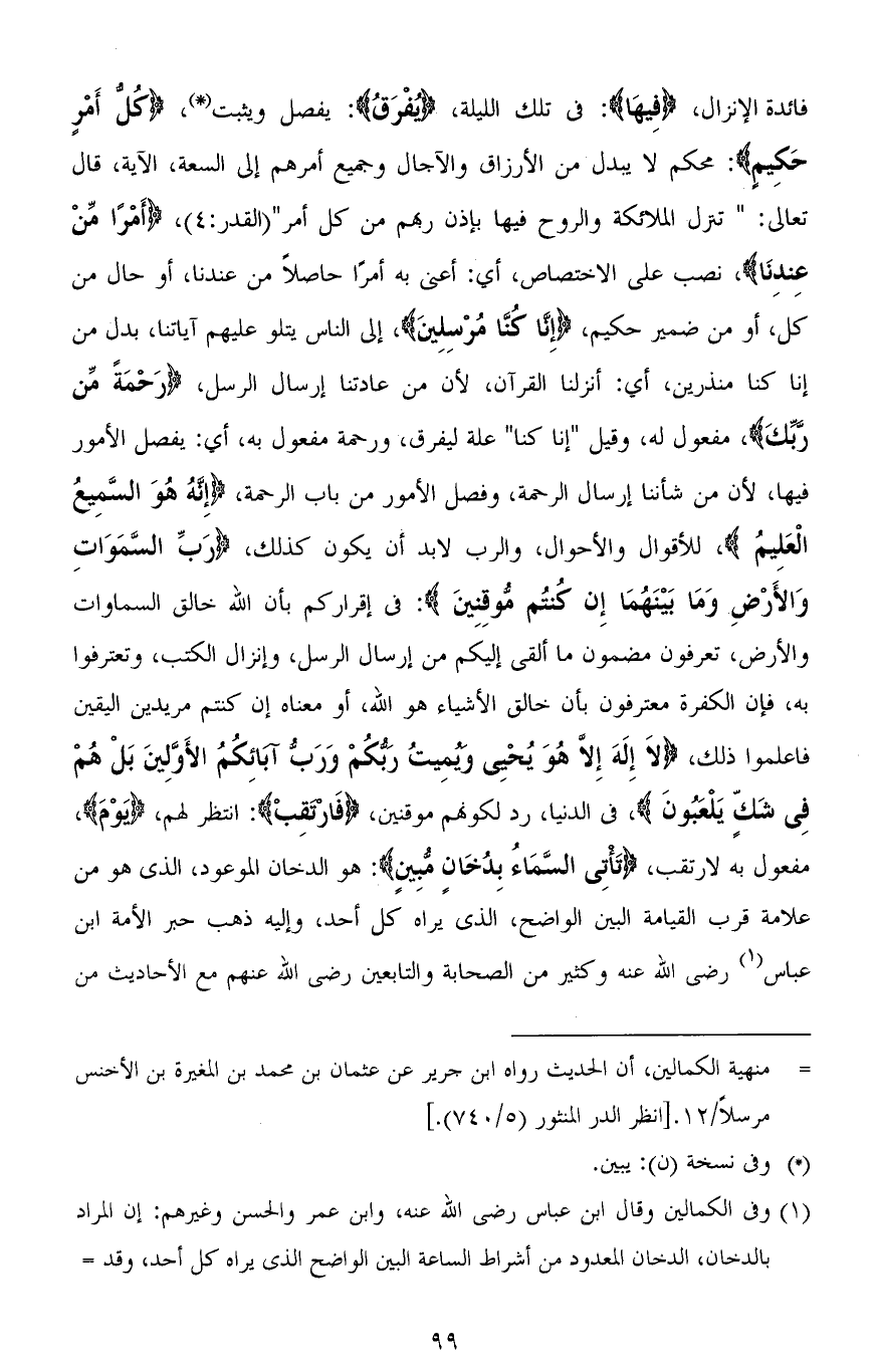 فائدة الإنزال، (فيهَا): في تلك الليلة، (يفْرَقُ): يفصل ويثبت (كُلُّ أَمْرٍ حَكِيمٍ): محكم لا يبدل من الأرزاق والآجال وجميع أمرهم إلى [السنة]، الآية، قال تعالى: (تَنَزَّلُ الْمَلَائِكَةُ وَالرُّوحُ فِيهَا بِإِذْنِ رَبِّهِمْ مِنْ كُلِّ أَمْرٍ) [القدر: 4]، (أَمْرًا مِنْ عِنْدِنَا)، نصب على الاختصاص، أي: أعني به أمرًا حاصلاً من عندنا، أو حال من كل، أو من ضمير حكيم، (إِنَّا كُنَّا مُرْسِلِينَ)، إلى الناس يتلو عليهم آياتنا، بدل من إنا كنا منذرين، أي: أنزلنا القرآن، لأن من عادتنا إرسال الرسل، (رَحْمَةً مِّن ربِّكَ)، مفعول له، وقيل " إنا كنا " علة ليفرق، ورحمة مفعول به، أي: يفصل الأمور فيها، لأن من شأننا إرسال الرحمة، وفصل الأمور من باب الرحمة، (إِنَّهُ هُوَ السَّمِيعُ الْعَلِيمُ)، للأقوال والأحوال، والرب لا بد أن يكون كذلك، (رَبِّ السَّمَاوَاتِ وَالأَرْضِ وَمَا بَيْنَهُمَا إِن كُنتُم مُّوقِنينَ): في إقراركم بأن الله خالق السماوات والأرض، تعرفون مضمون ما ألقى إليكم من إرسال الرسل، وإنزال الكتب، وتعترفوا به، فإن الكفرة معترفون بأن خالق الأشياء هو الله، أو معناه إن كنتم مريدين اليقين فاعلموا ذلك، (لَا إِلَهَ إِلَّا هُوَ يُحْيِي وَيُمِيتُ رَبُّكُمْ وَرَبُّ آبَائِكُمُ الْأَوَّلِينَ بَلْ هُمْ فِي شَكٍّ يَلْعَبُونَ)، في الدنيا، رد لكونهم موقنين، (فَارتقِبْ): انتظر لهم، (يَوْمَ)، مفعول به لارتقب، (تَأْتِي السَّمَاءُ بِدُخَانٍ مُبِينٍ): هو الدخان الموعود، الذي هو من علامة قرب القيامة البين الواضح، الذي يراه كل أحد، وإليه ذهب حبر الأمة ابن عباس رضي الله عنهما وكثير من الصحابة والتابعين رضي الله عنهم مع الأحاديث من
