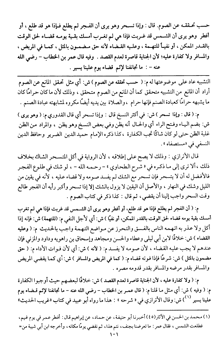 أن الفجر لم يطلع فإذا هو قد طلع، أو أفطر وهو يرى أن الشمس قد غربت فإذا هي لم تغرب أمسك بقية يومه قضاء لحق الوقت بالقدر الممكن، أو نفيا للتهمة، وعليه القضاء لأنه حق مضمون بالمثل، كما في المريض، والمسافر ولا كفارة عليه؛ لأن الجناية قاصرة لعدم القصد. وفيه قال عمر بن الخطاب - رَضِيَ اللَّهُ عَنْهُ -: ما تجانفنا لإثم قضاء يوم علينا يسير