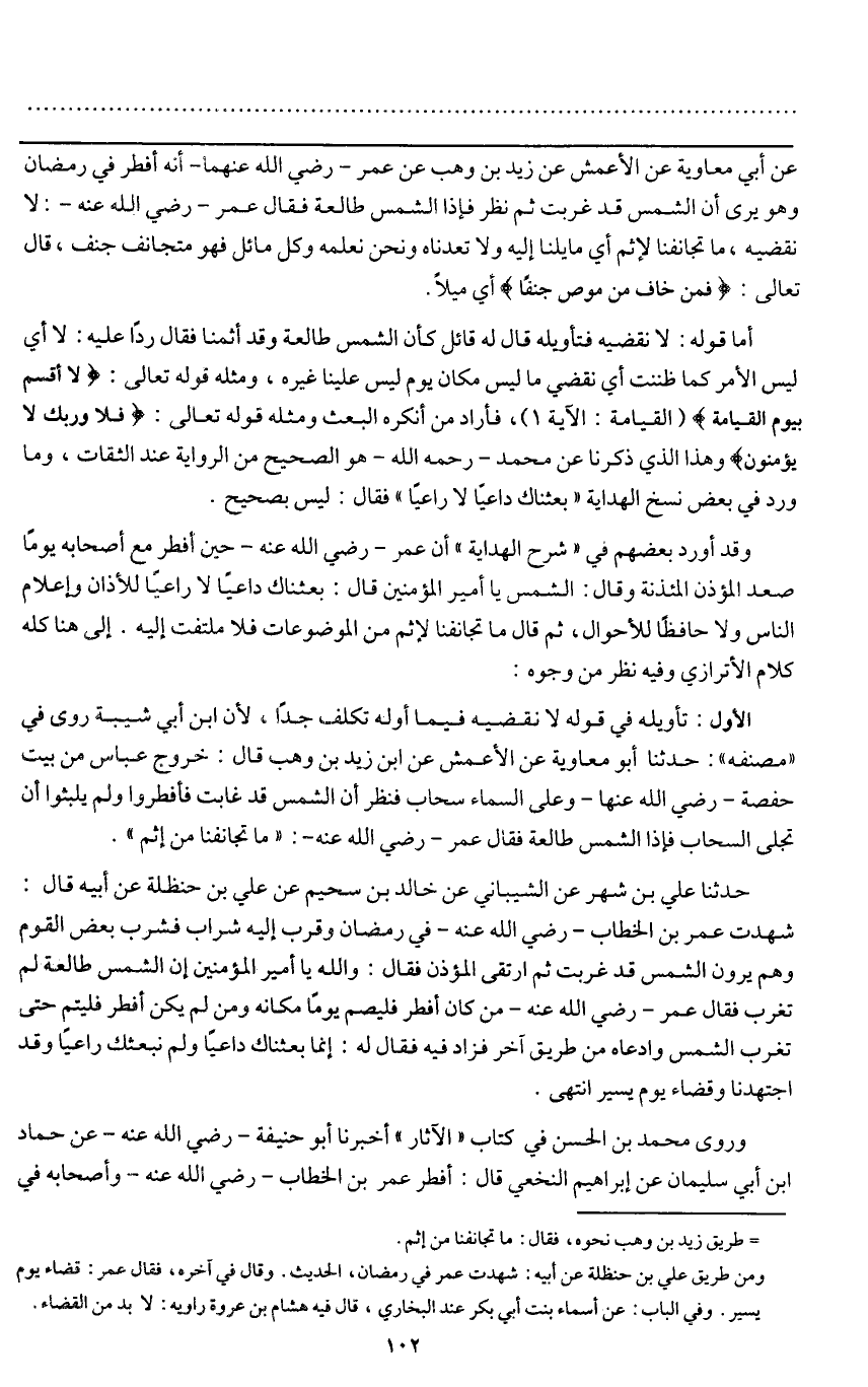 ـــــــــــــــــــــــــــــQعن أبي معاوية عن الأعمش عن زيد بن وهب عن عمر - رَضِيَ اللَّهُ عَنْهُمَا - أنه أفطر في رمضان وهو يرى أن الشمس قد غربت ثم نظر فإذا الشمس طالعة فقال عمر - رَضِيَ اللَّهُ عَنْهُ -: لا نقضيه، ما تجانفنا لإثم أي مايلنا إليه ولا تعديناه ونحن نعلمه وكل مائل فهو متجانف جنف، قال تعالى: {فَمَنْ خَافَ مِنْ مُوصٍ جَنَفًا} [البقرة: 182] أي ميلاً.