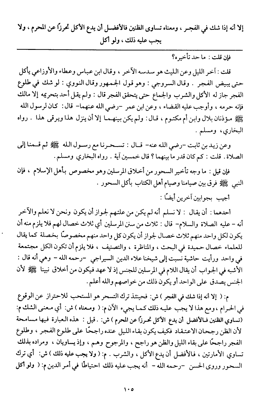 وعن زيد بن ثابت - رَضِيَ اللَّهُ عَنْهُ - قال: «تسحرنا مع رسول الله - صَلَّى اللَّهُ عَلَيْهِ وَسَلَّمَ - ثم قمنا إلى الصلاة. قلت: كم كان قدر ما بينهما؟ قال خمسين آية» . رواه البخاري ومسلم.