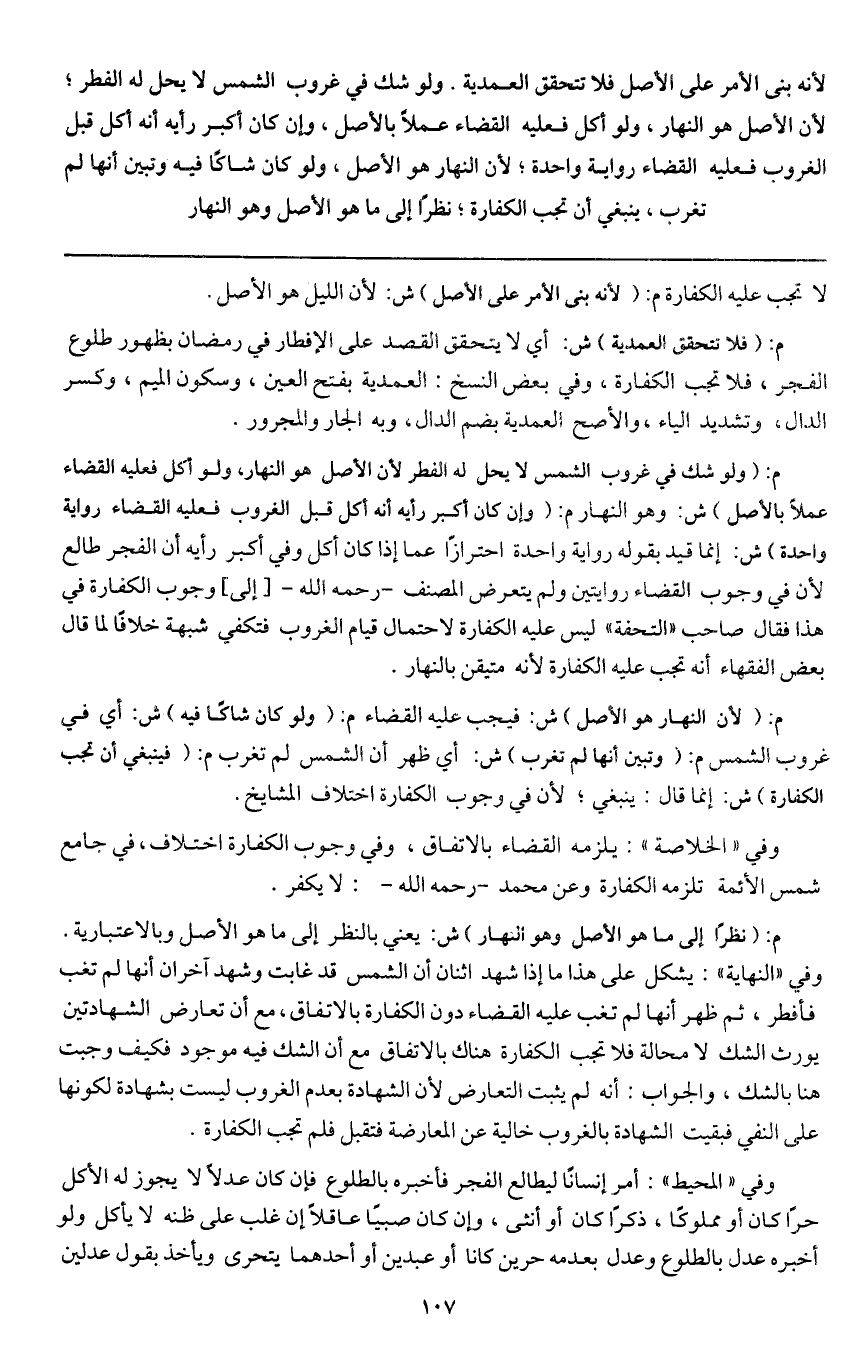 ولو شك في غروب الشمس لا يحل له الفطر؛ لأن الأصل هو النهار، ولو أكل فعليه القضاء عملا بالأصل، وإن كان أكبر رأيه أنه أكل قبل الغروب فعليه القضاء رواية واحدة؛ لأن النهار هو الأصل، ولو كان شاكا فيه وتبين أنها لم تغرب، ينبغي أن تجب الكفارة؛ نظرا إلى ما هو الأصل وهو النهار